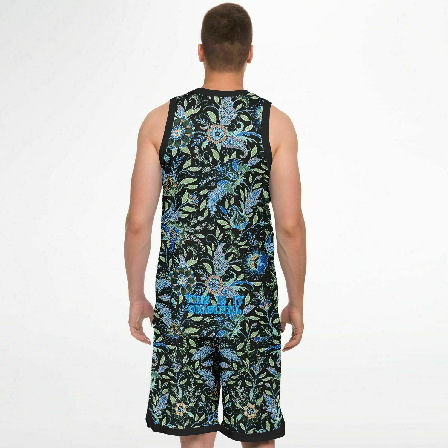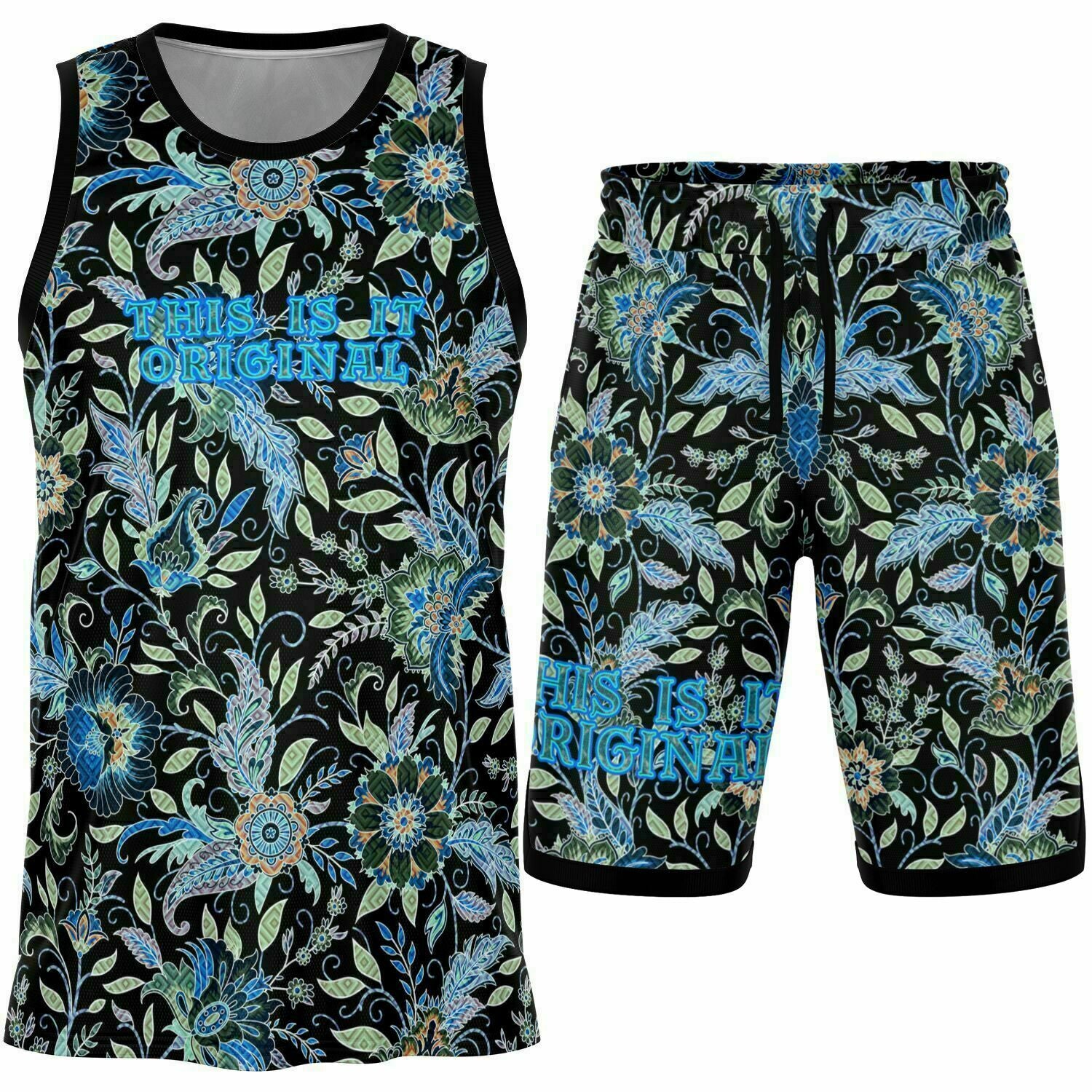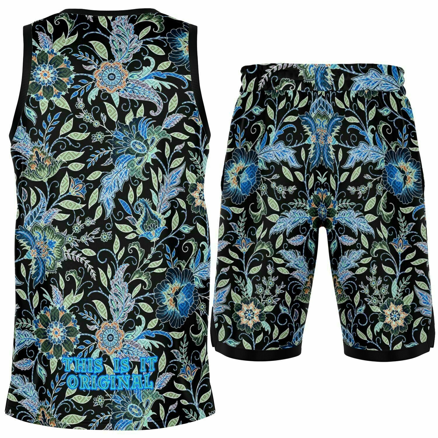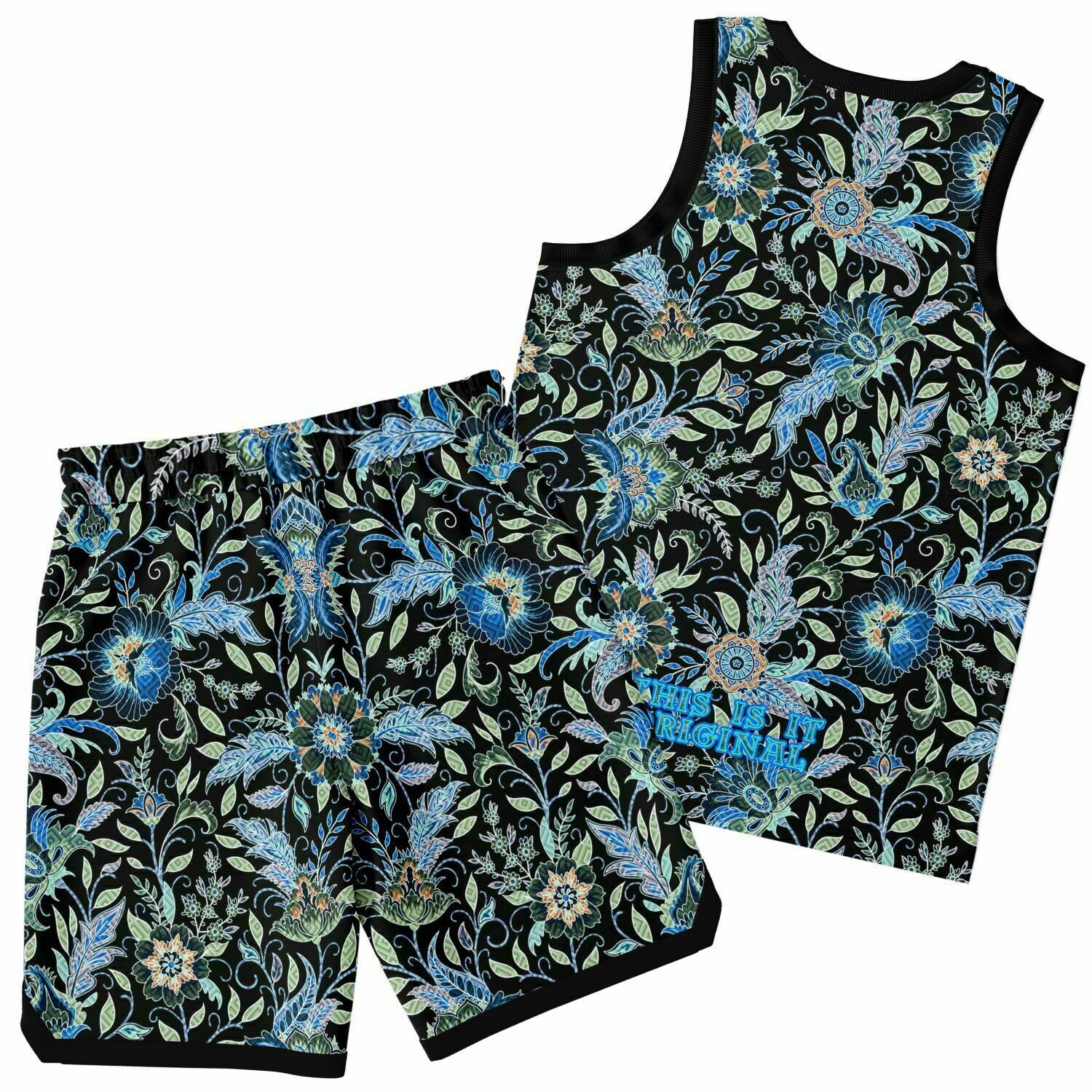 Black and Blue Exotic Floral Pattern Design on Basketball Unisex Jersey & Shorts Set all Black Edition