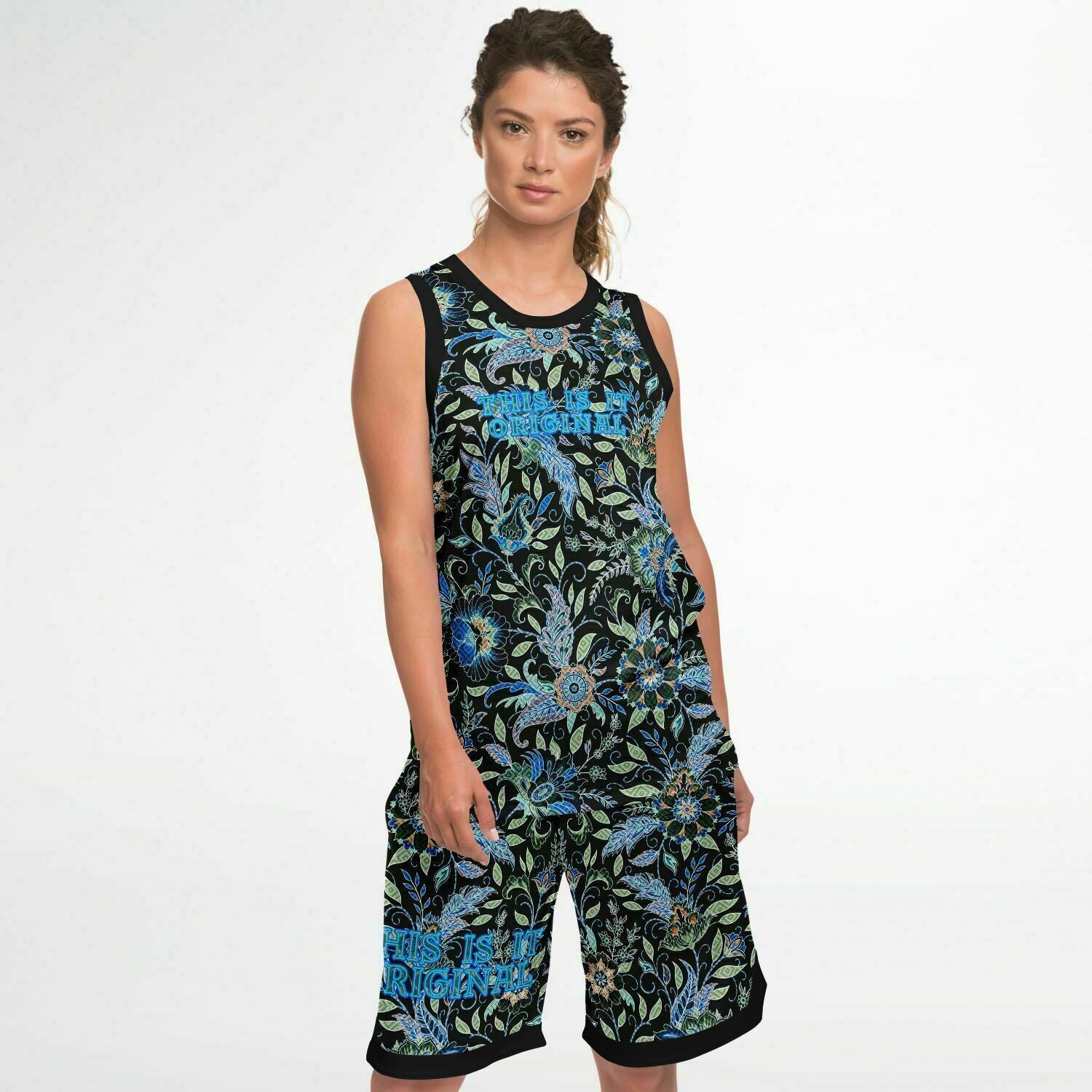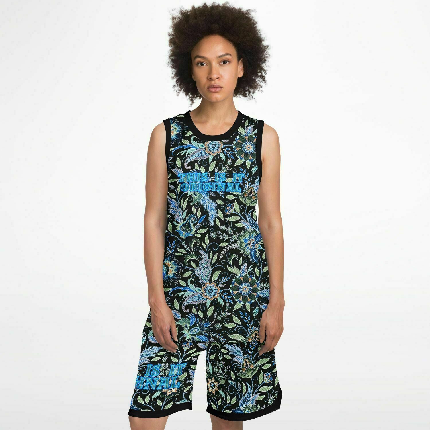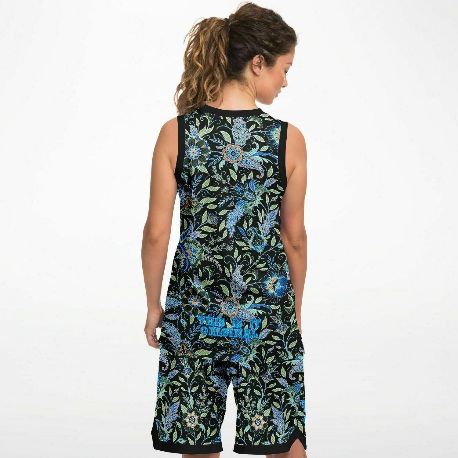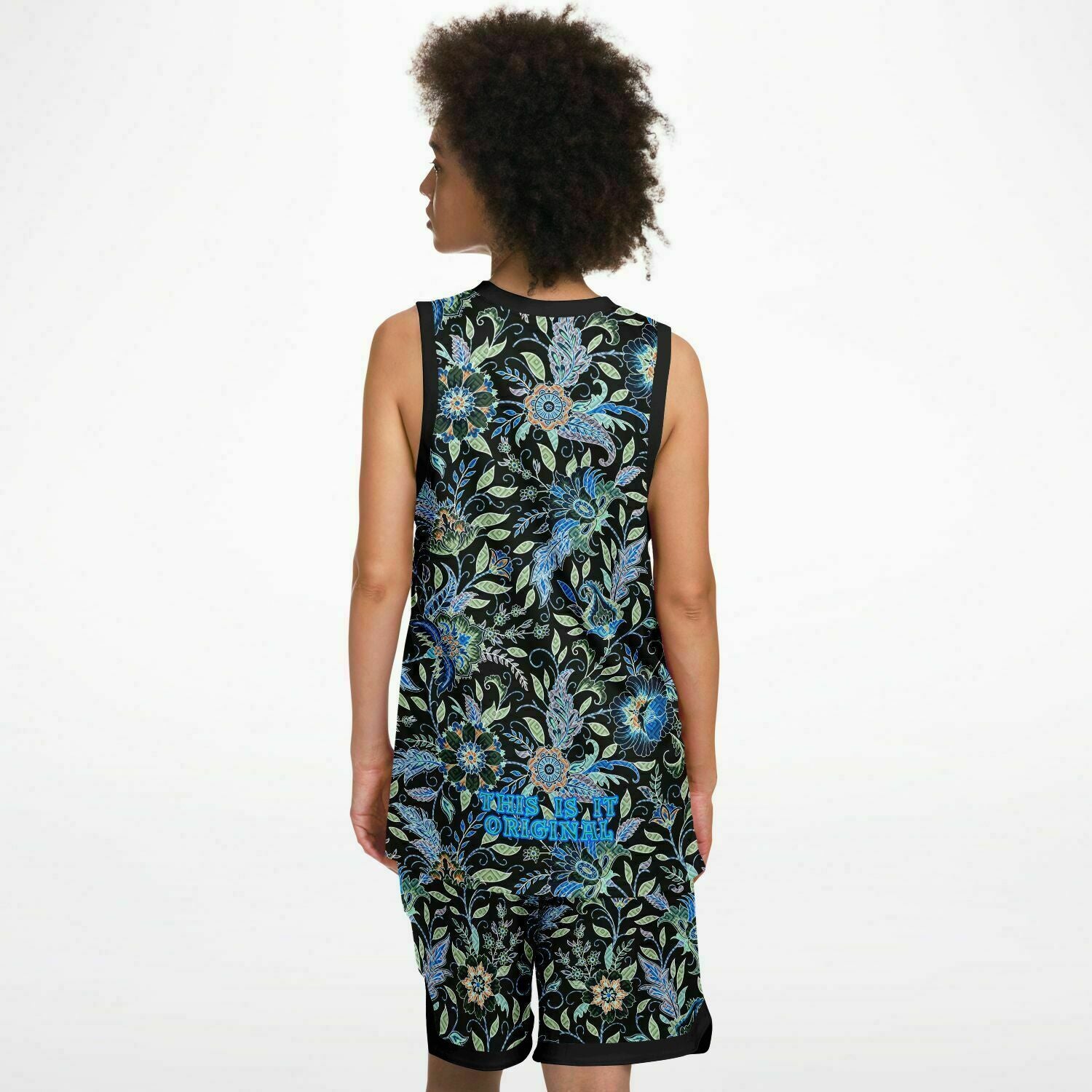 Black and Blue Exotic Floral Pattern Design on Basketball Unisex Jersey & Shorts Set all Black Edition
