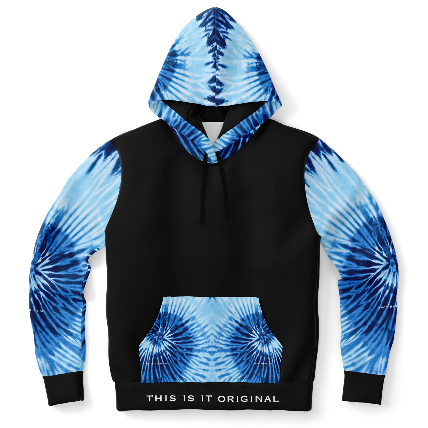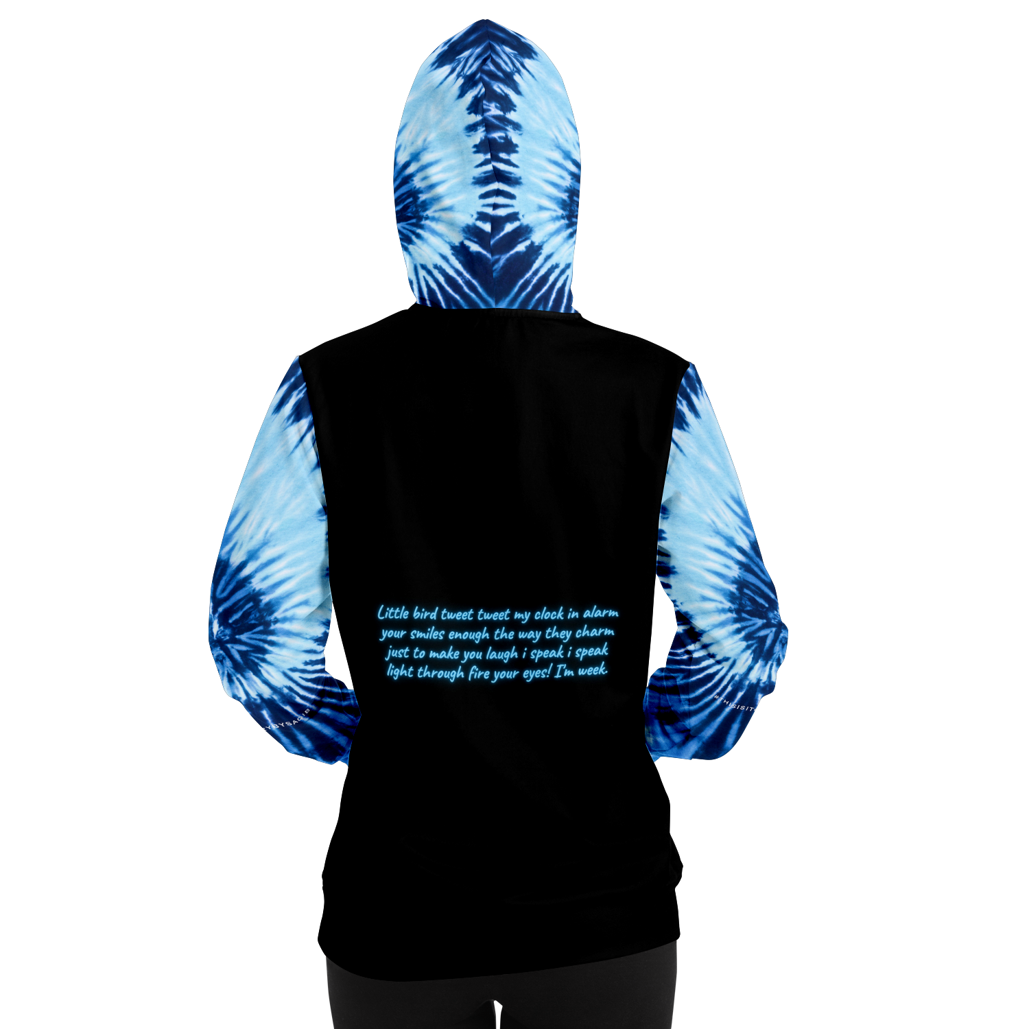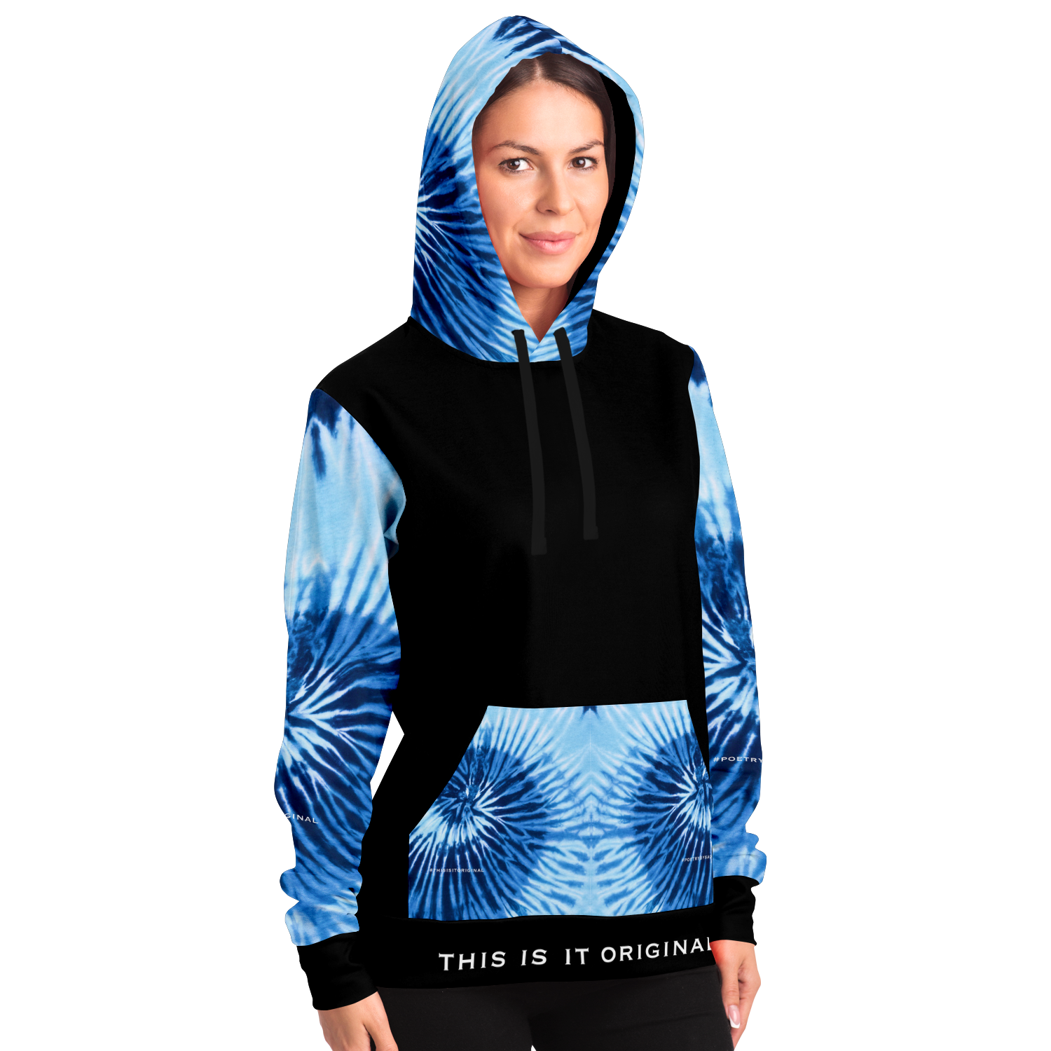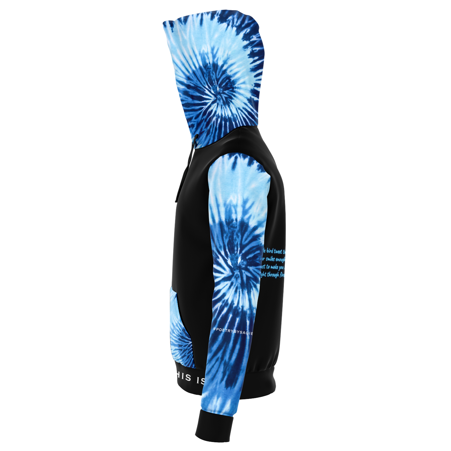 Luxury Poetry on Black with Light Blue & Dark Blue Tie Dye Design Three Fashion Hoodie