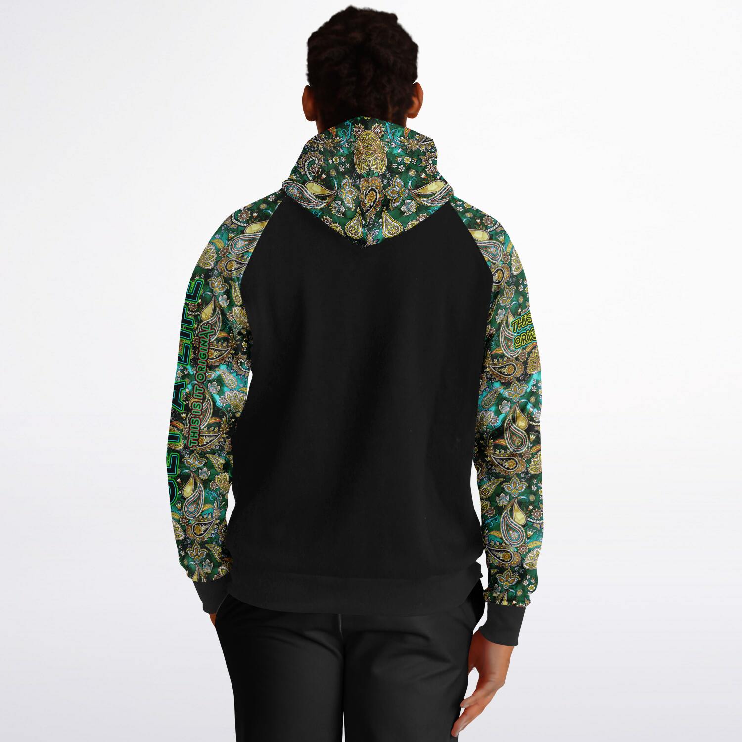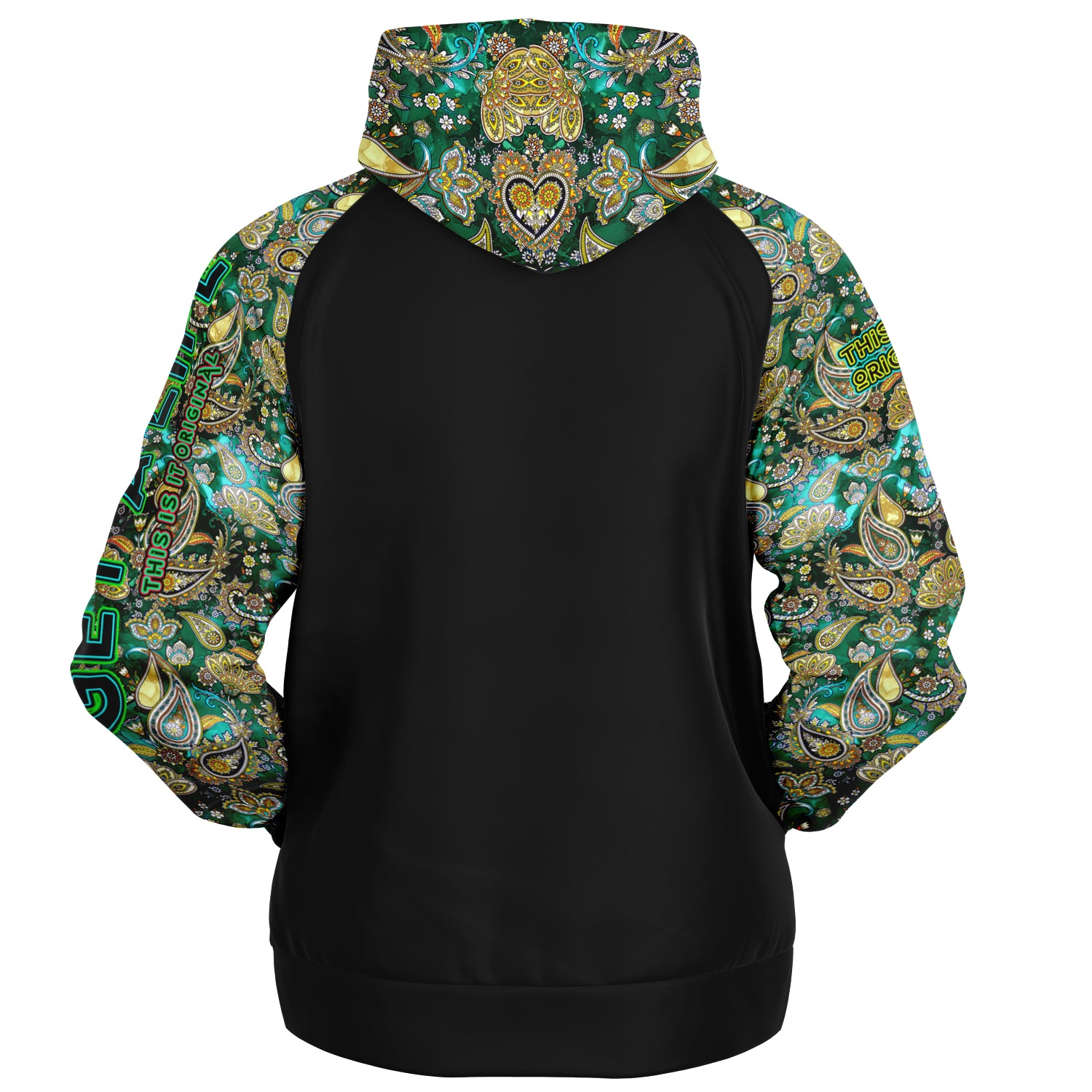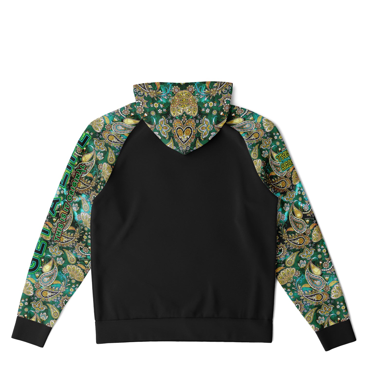 Raglan Unisex Black Hoodie with Emerald Luxury Golden Paisley Design with "Get a Life" on Left Hand