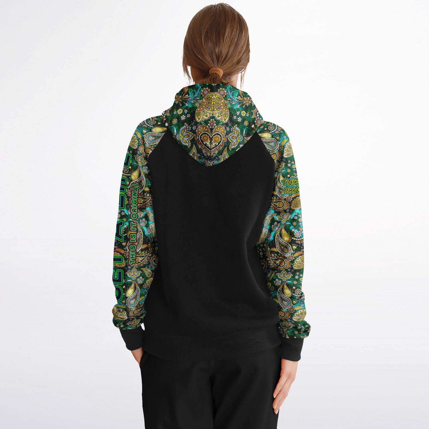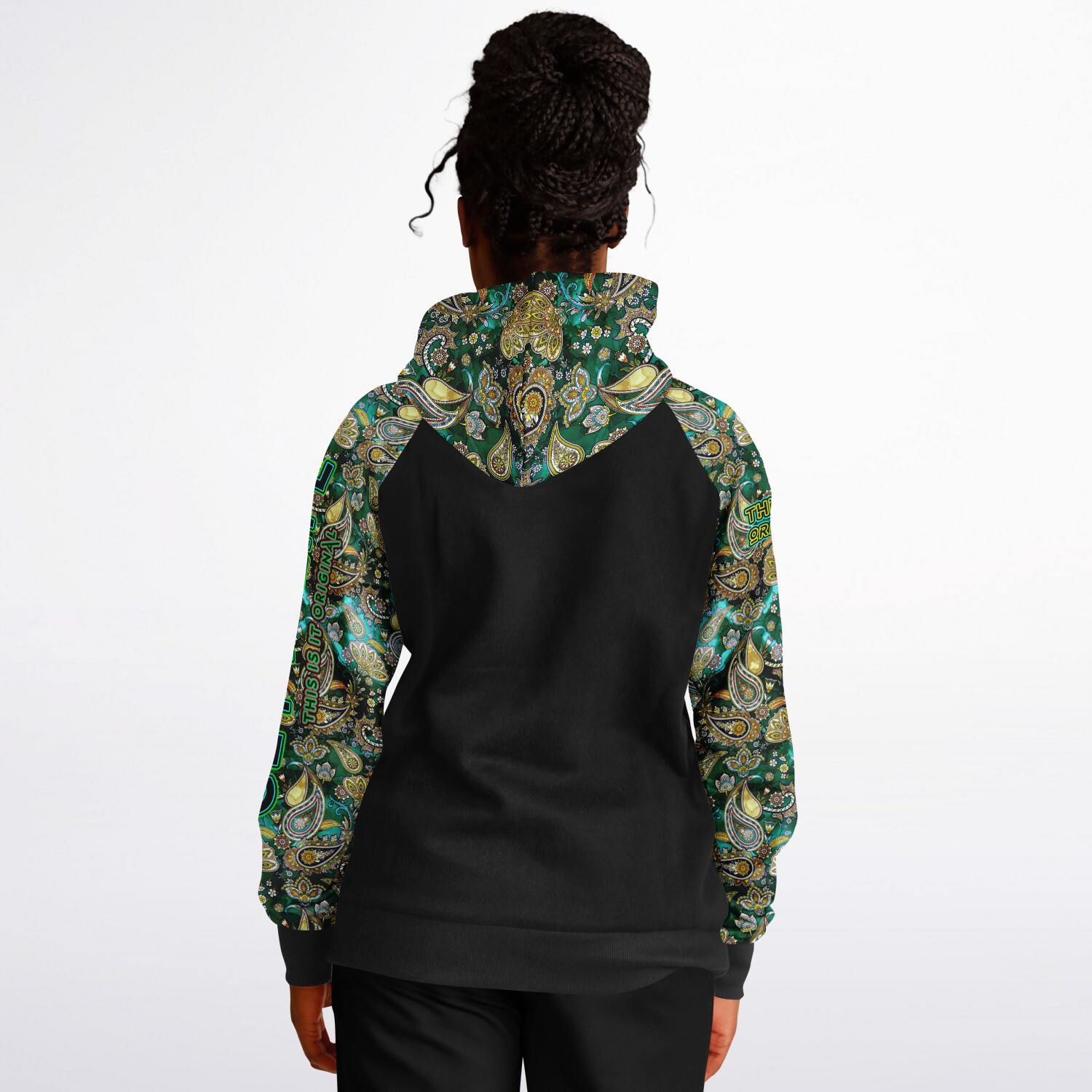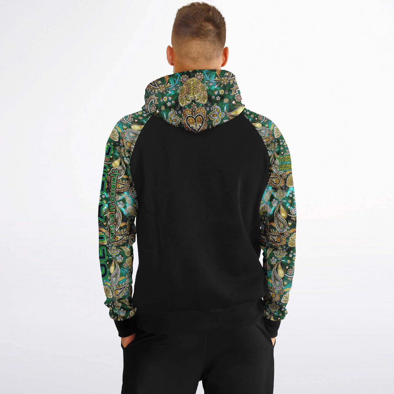 Raglan Unisex Black Hoodie with Emerald Luxury Golden Paisley Design with "Get a Life" on Left Hand