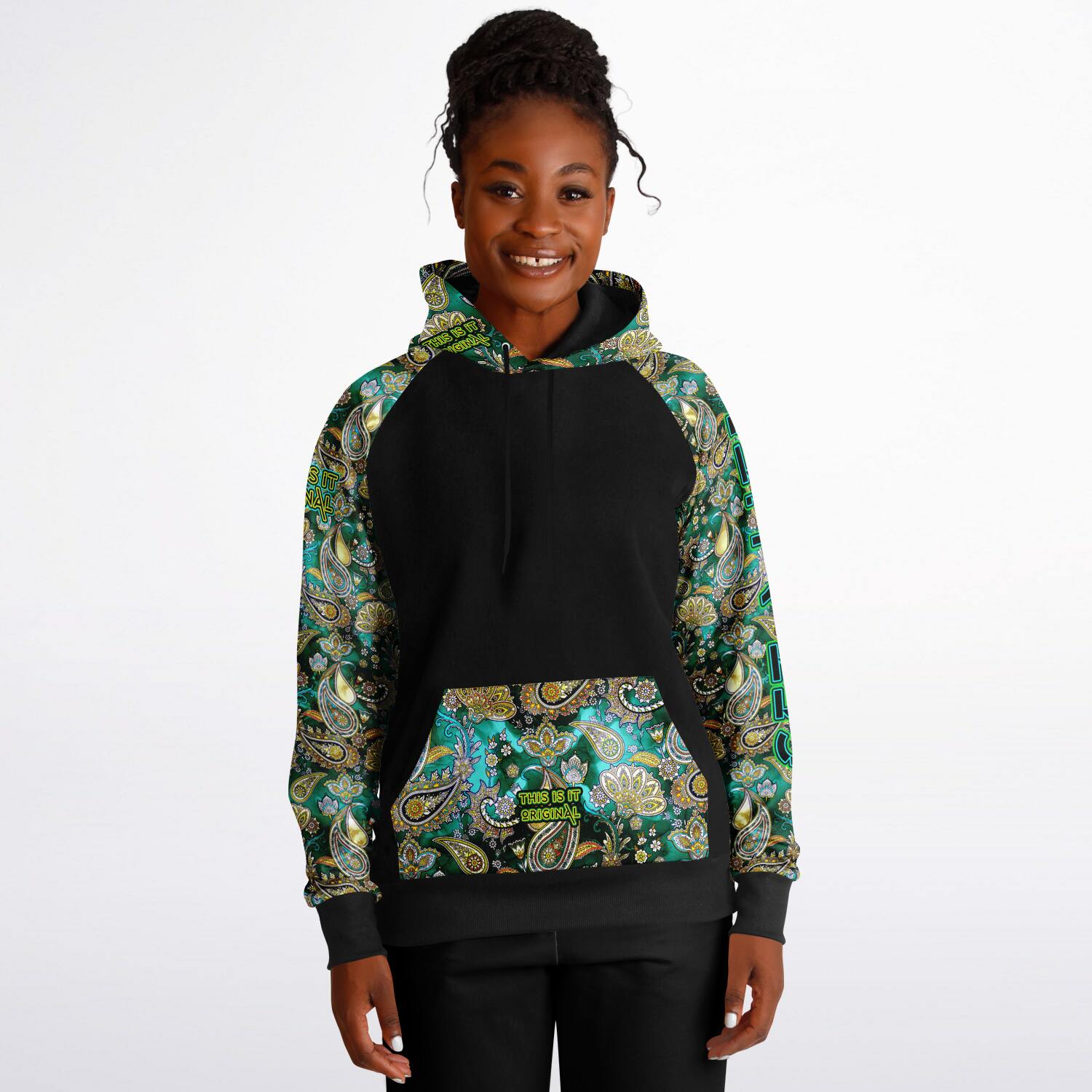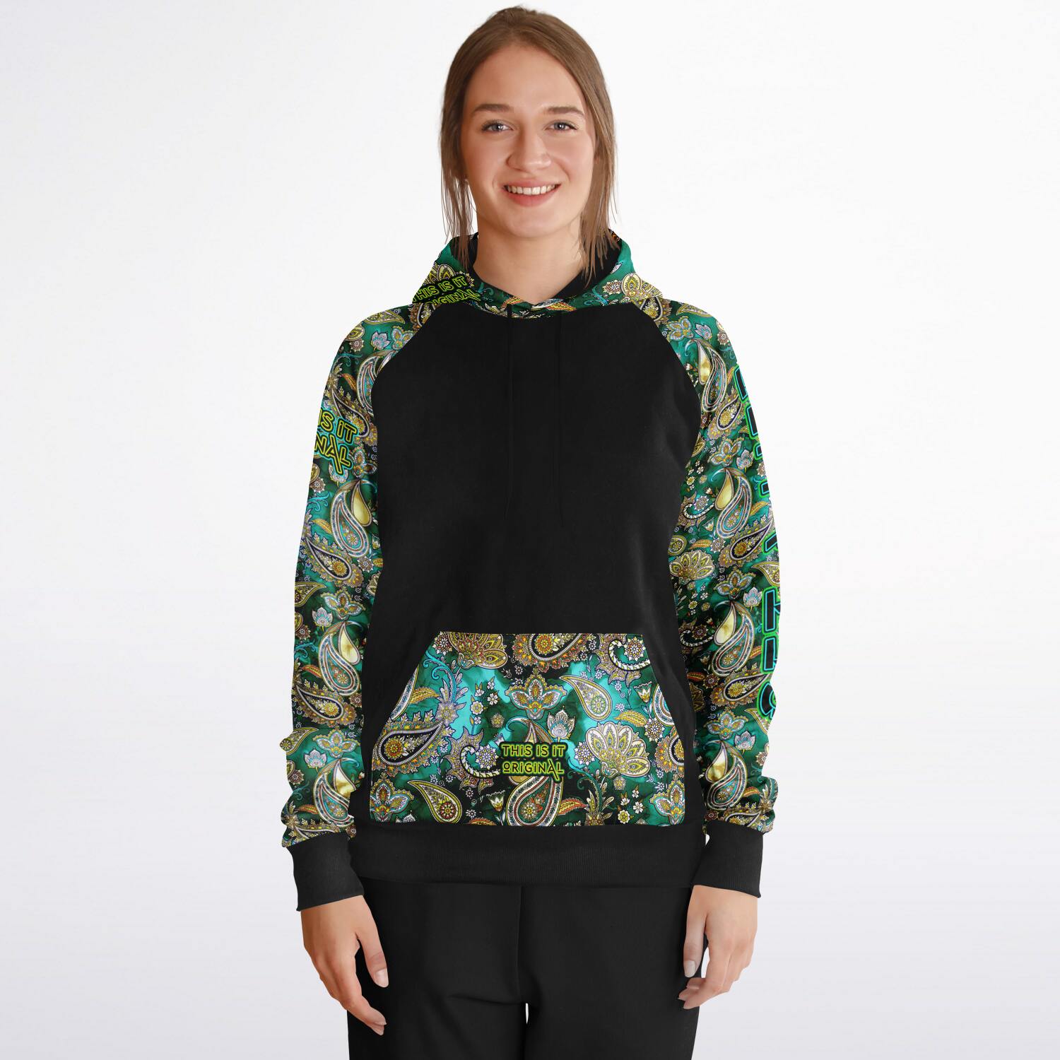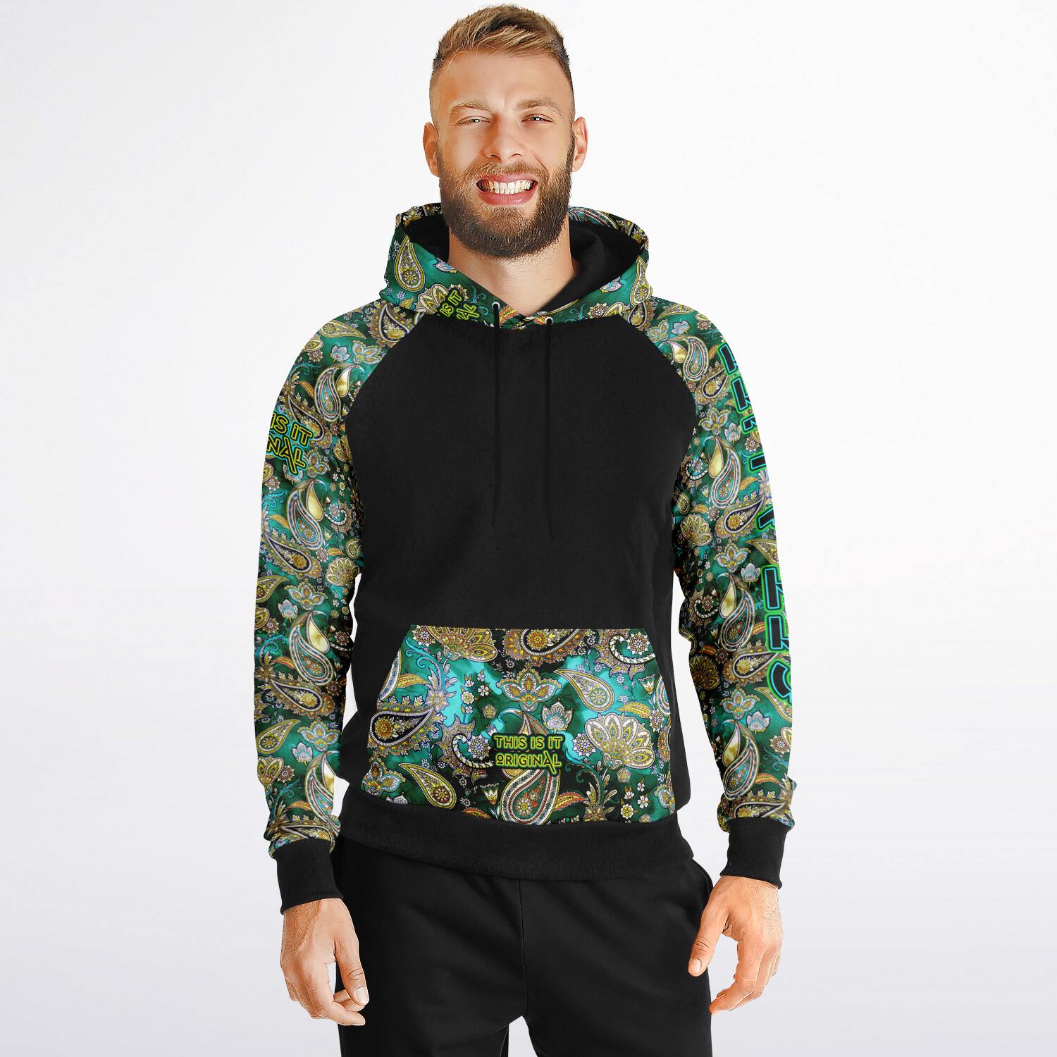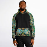 Discover the fusion of functionality and fashion with this raglan hoodie. This unisex hoodie is the perfect pick for those who value both comfort and style. The solid body and accents provide a sleek backdrop to the standout prints adorning the sleeves, kangaroo pocket, and outer hood. Crafted from a comfortable blend of cotton, polyester, and spandex, it’s designed to fit effortlessly into any casual attire. This hoodie is a versatile piece that's as suitable for a laid-back weekend as it is for a casual meet-up.
