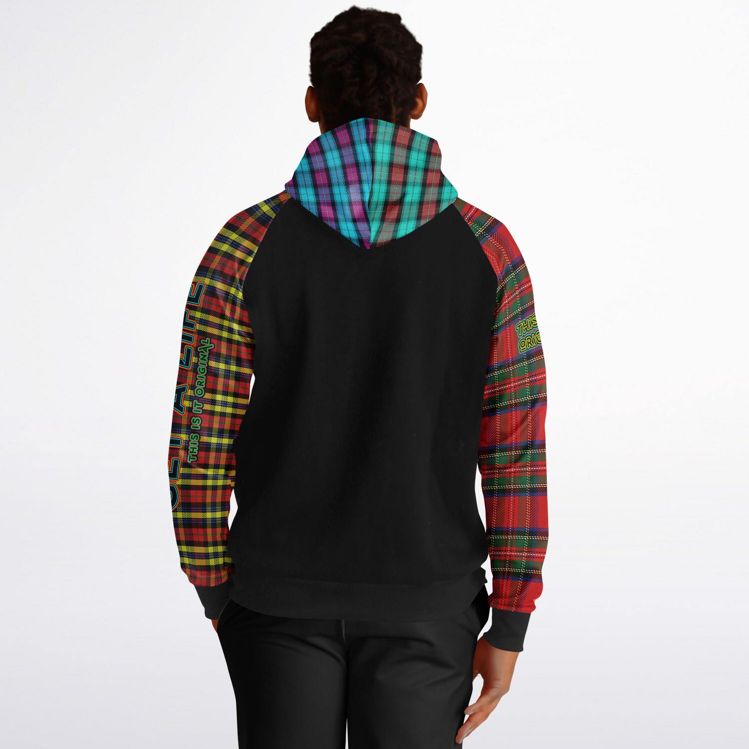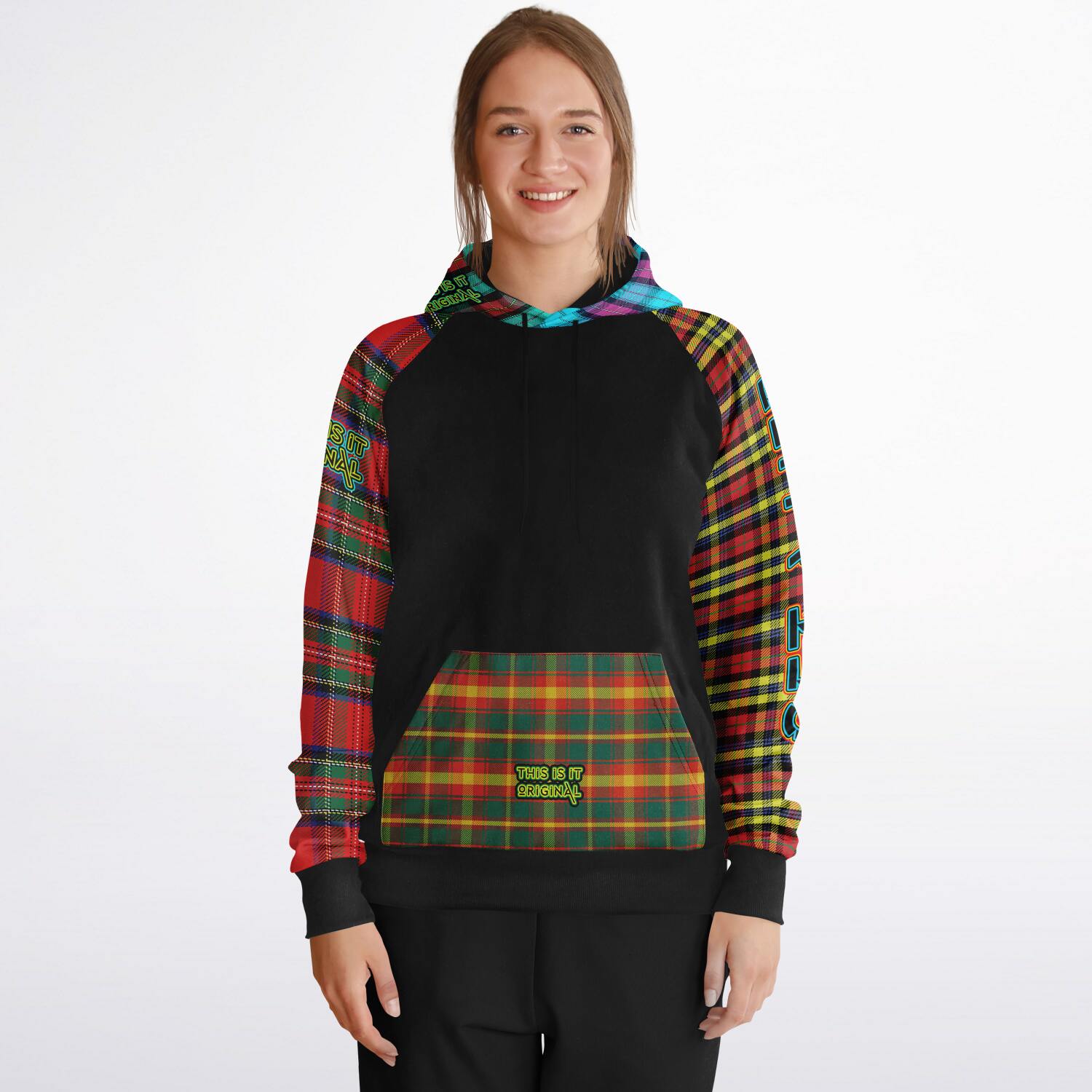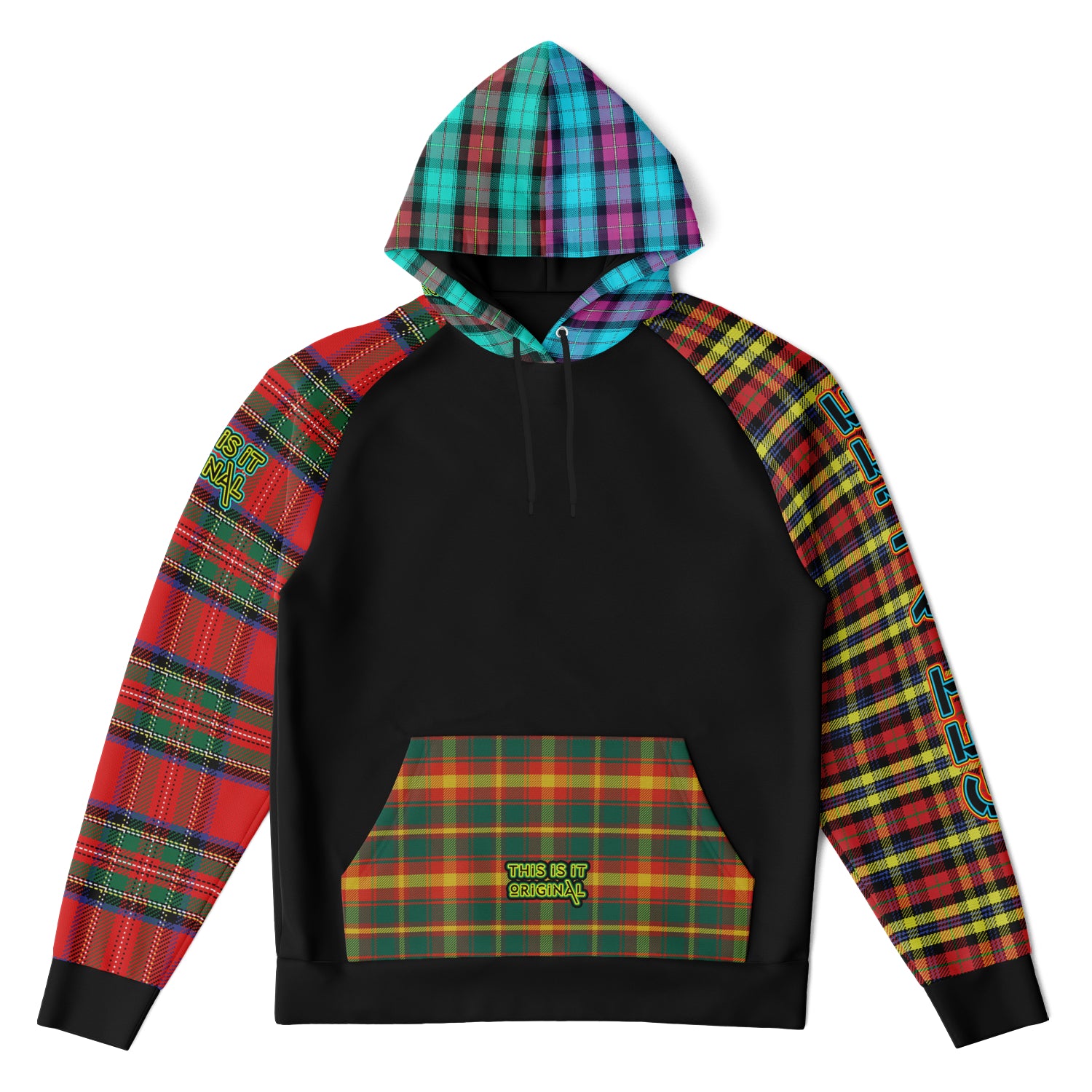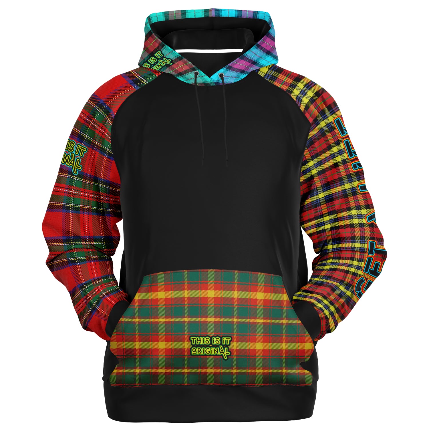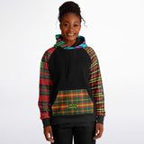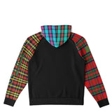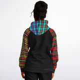 Raglan Unisex Black Hoodie with Mix of Tartan Colors and Perfect "Get a Life" on Left Hand