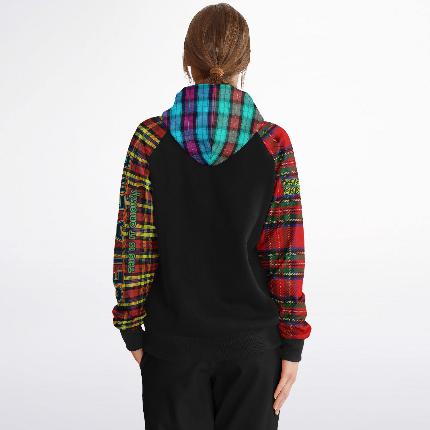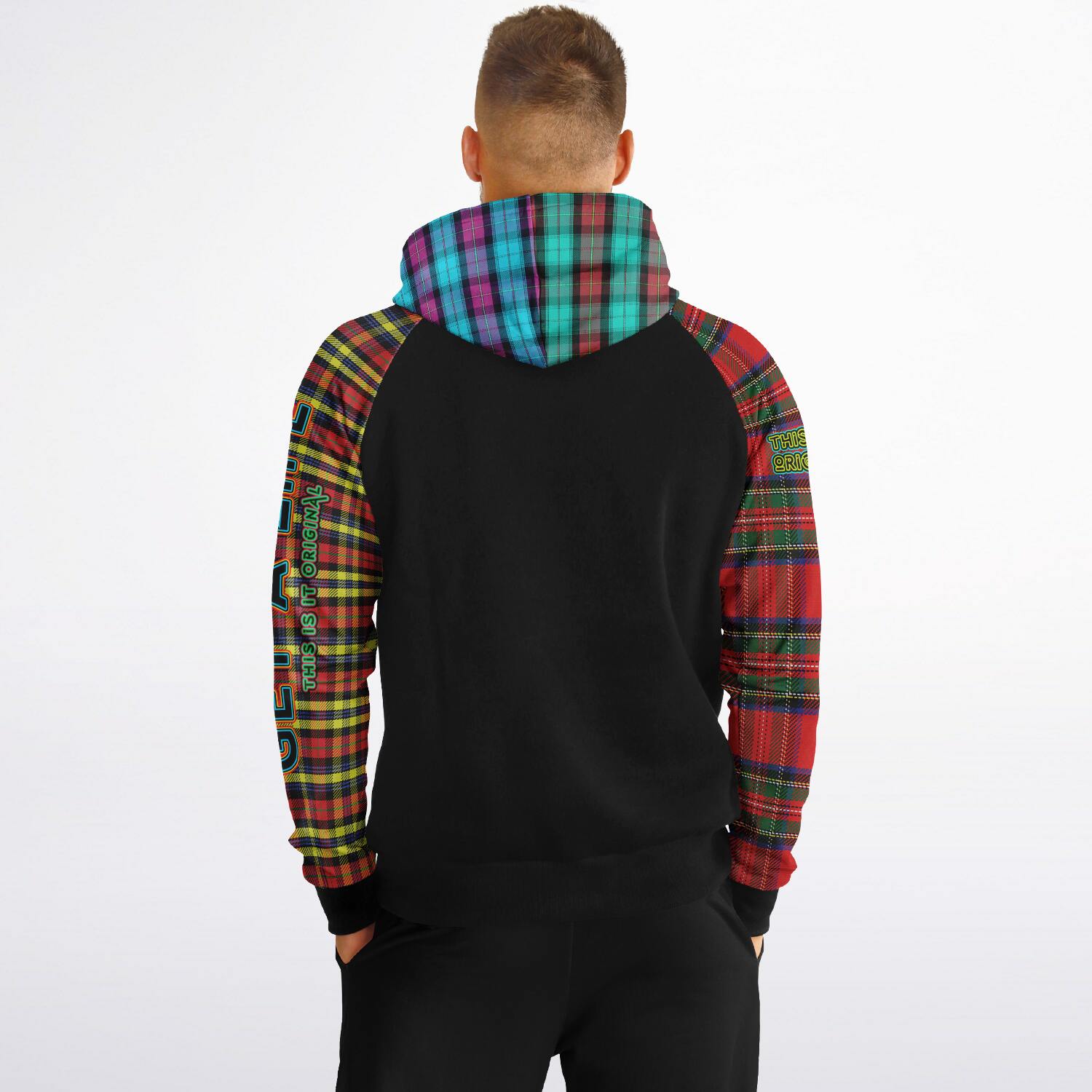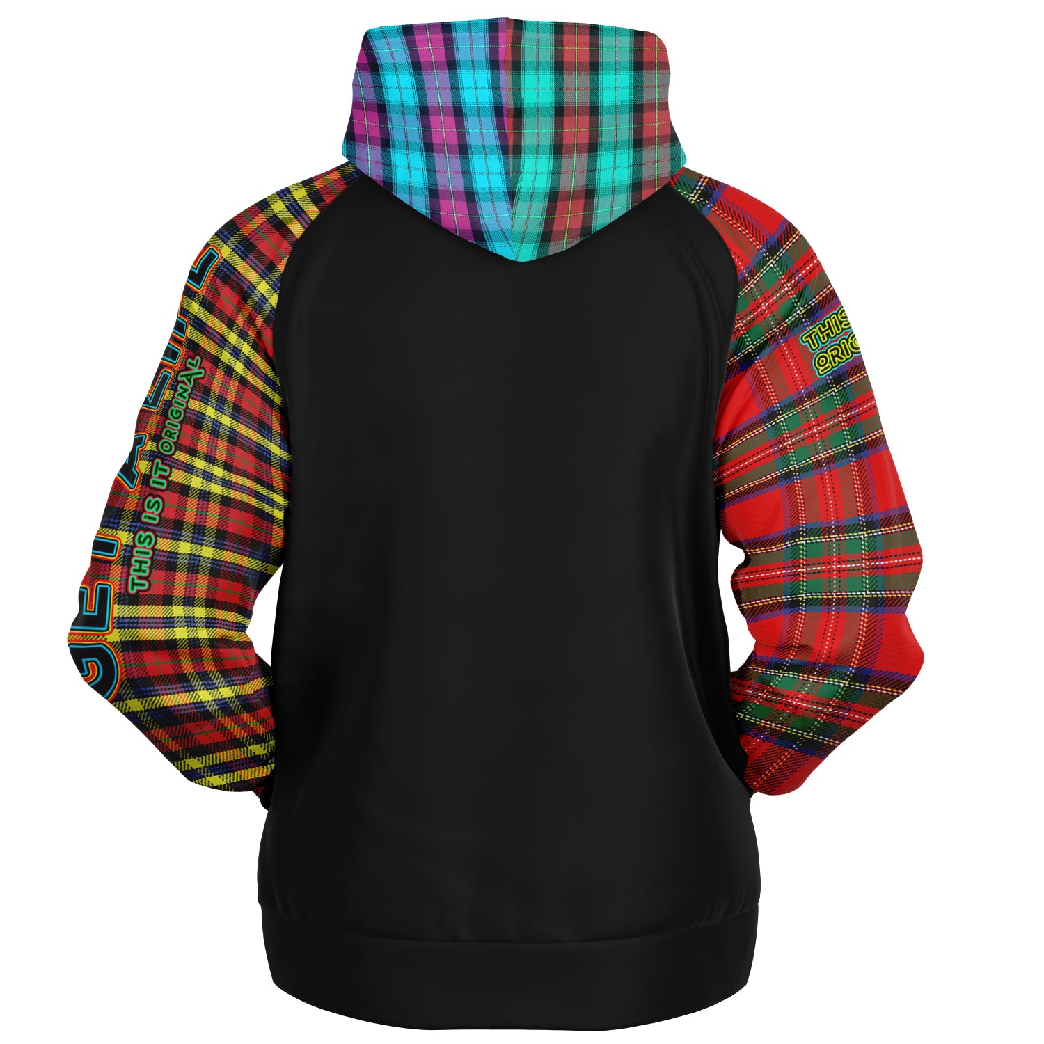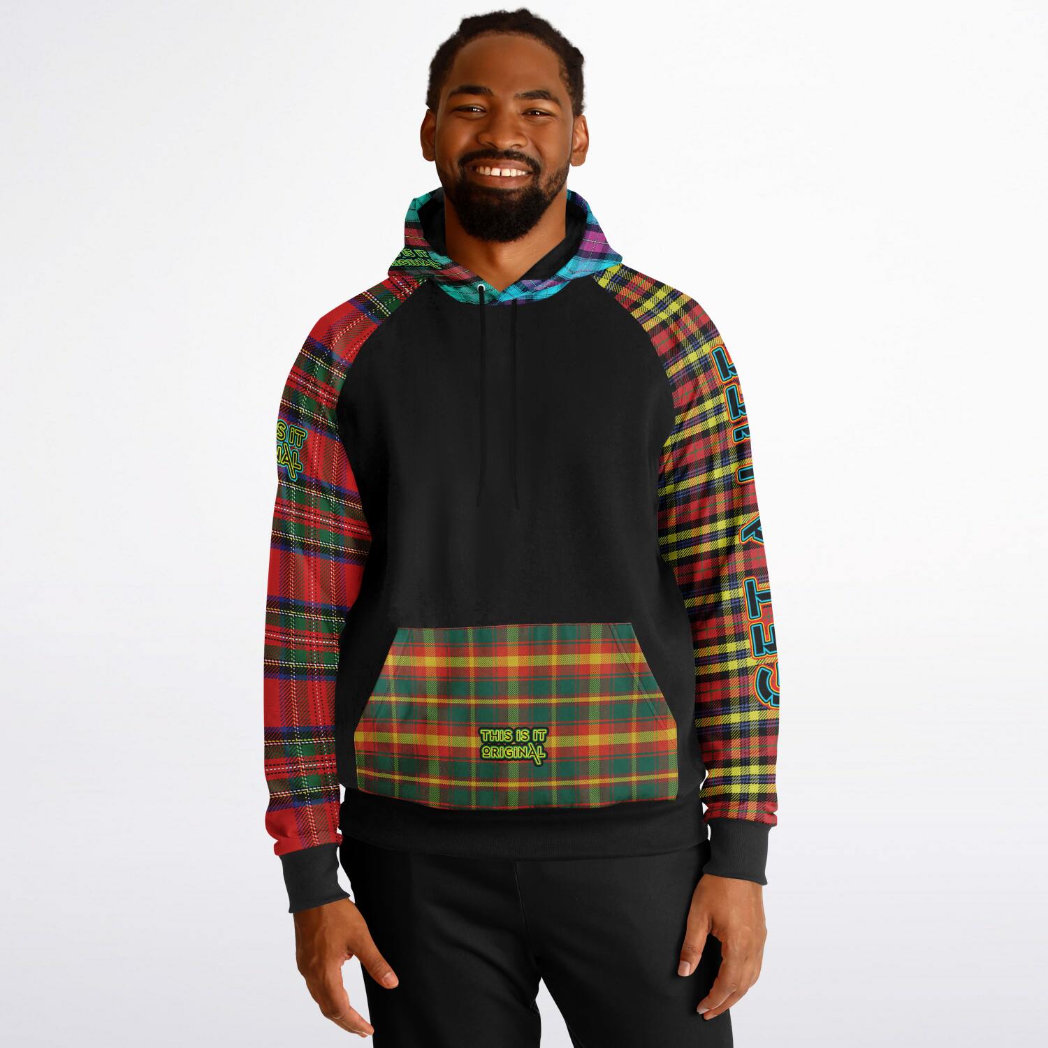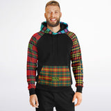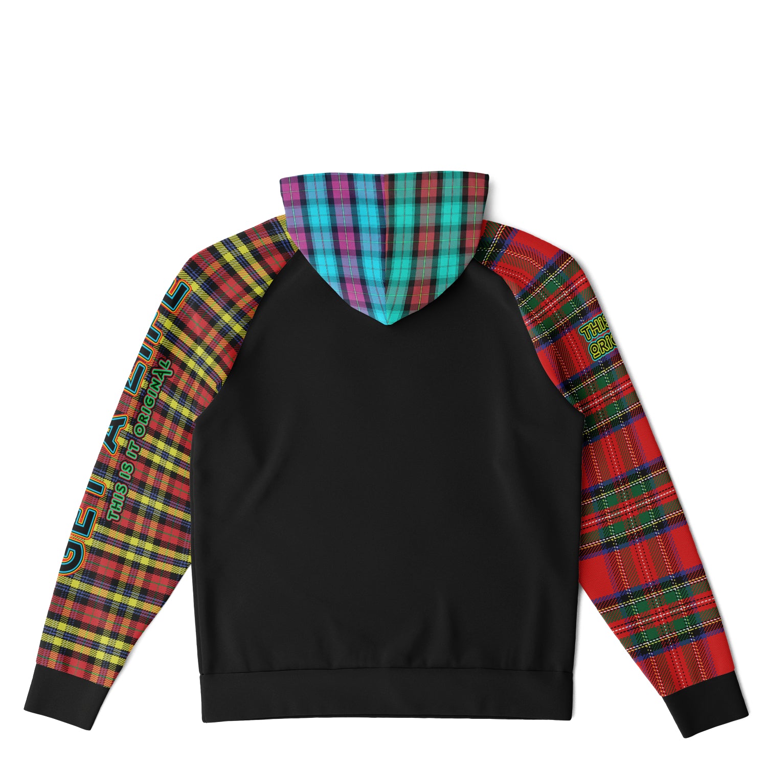 Raglan Unisex Black Hoodie with Mix of Tartan Colors and Perfect "Get a Life" on Left Hand