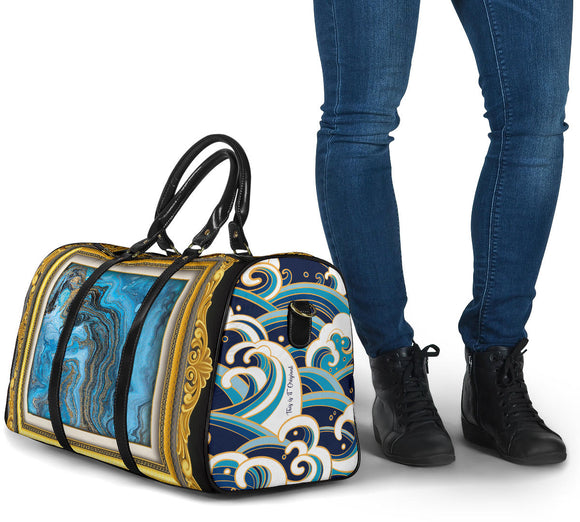 Luxury Japan Wave X Blue Marble Art in Gold Frame Design Travel Bag