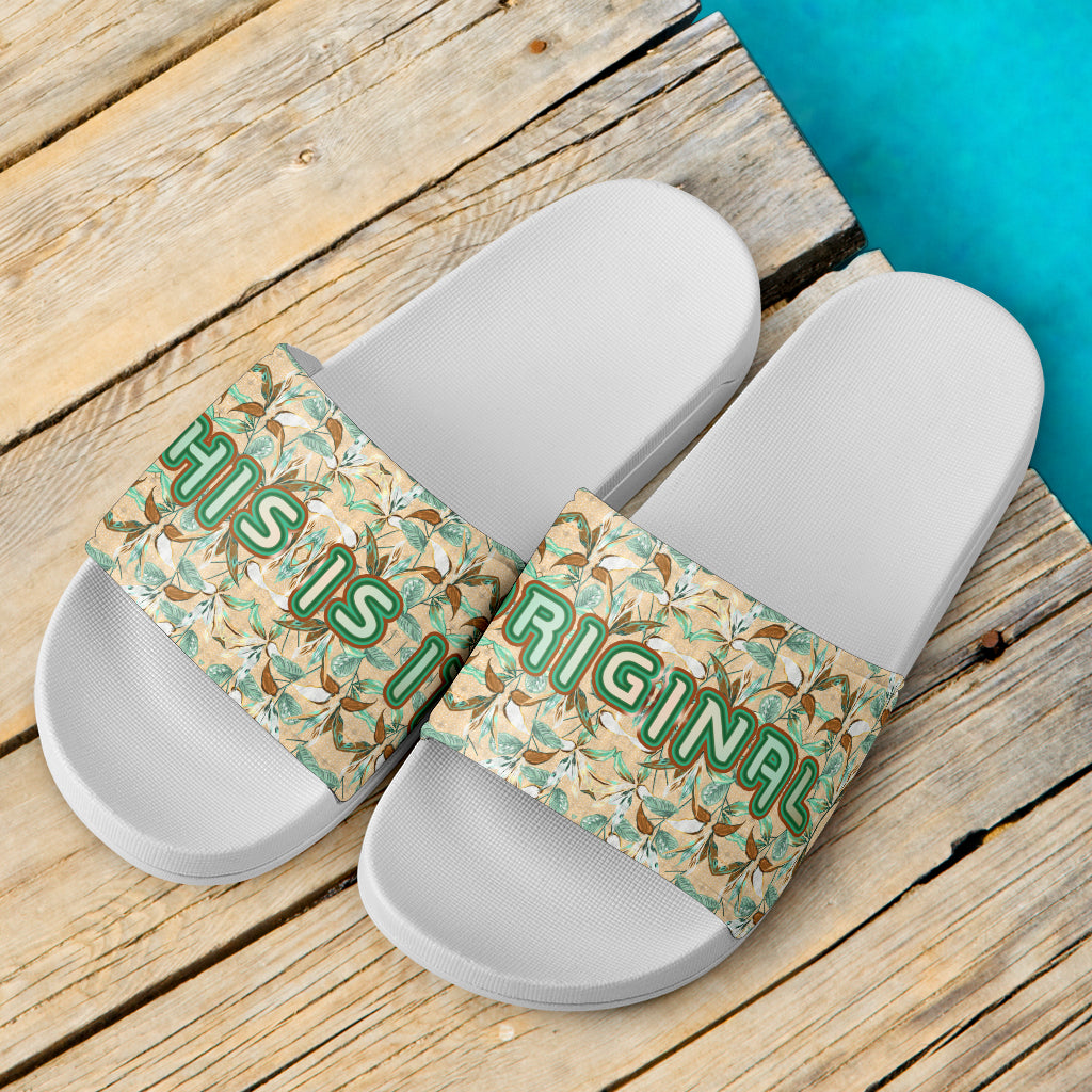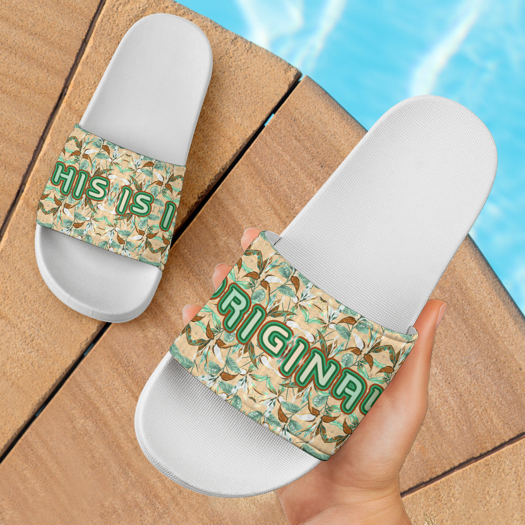 Abstract Flowers Pattern Design in Army Beige and Green Colors Slide Sandals