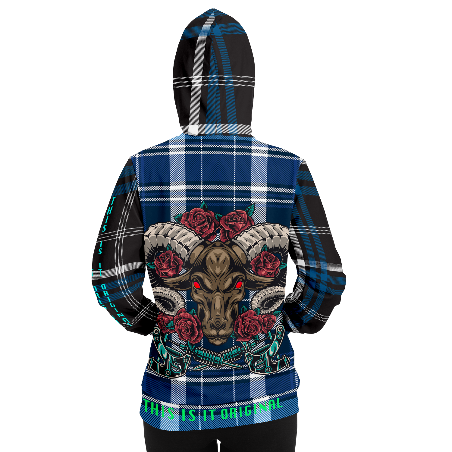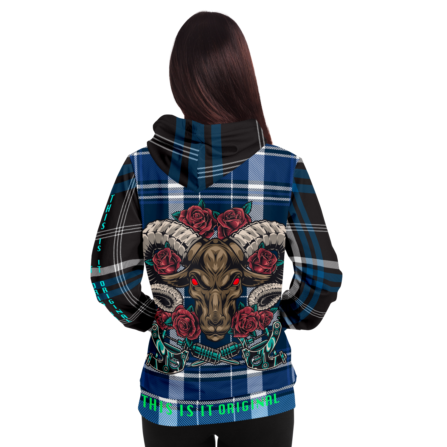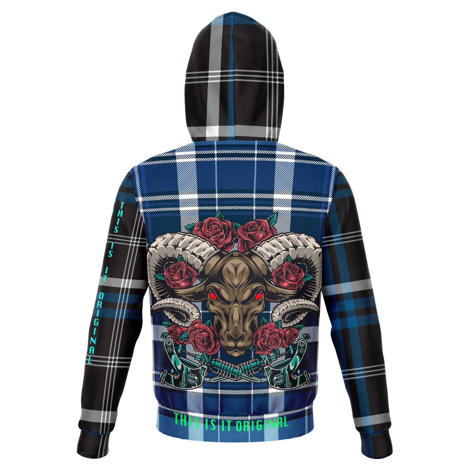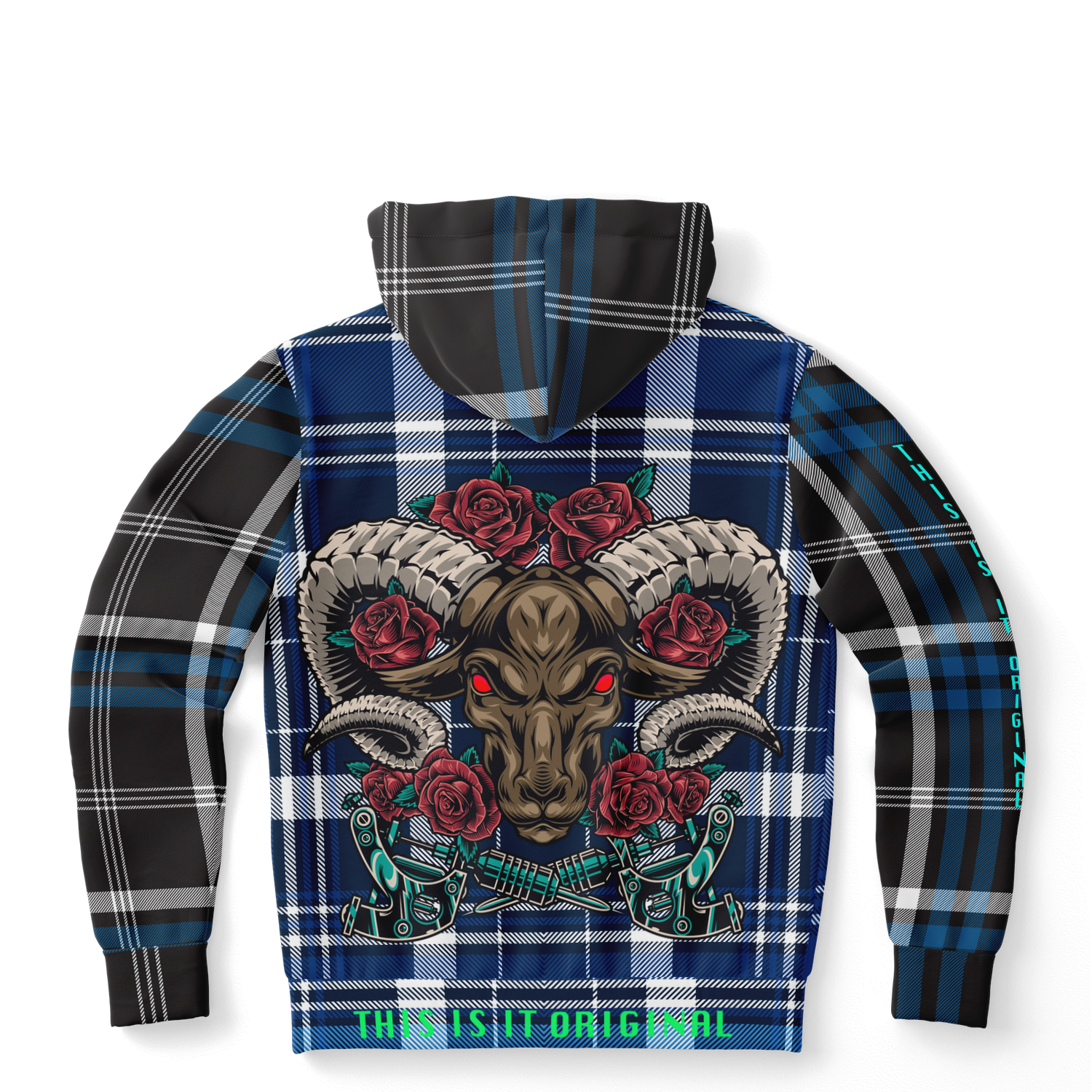 Black & Deep Blue Tartan Design with Ninja Angry Aries with Red Eyes Luxury Fashion Hoodie