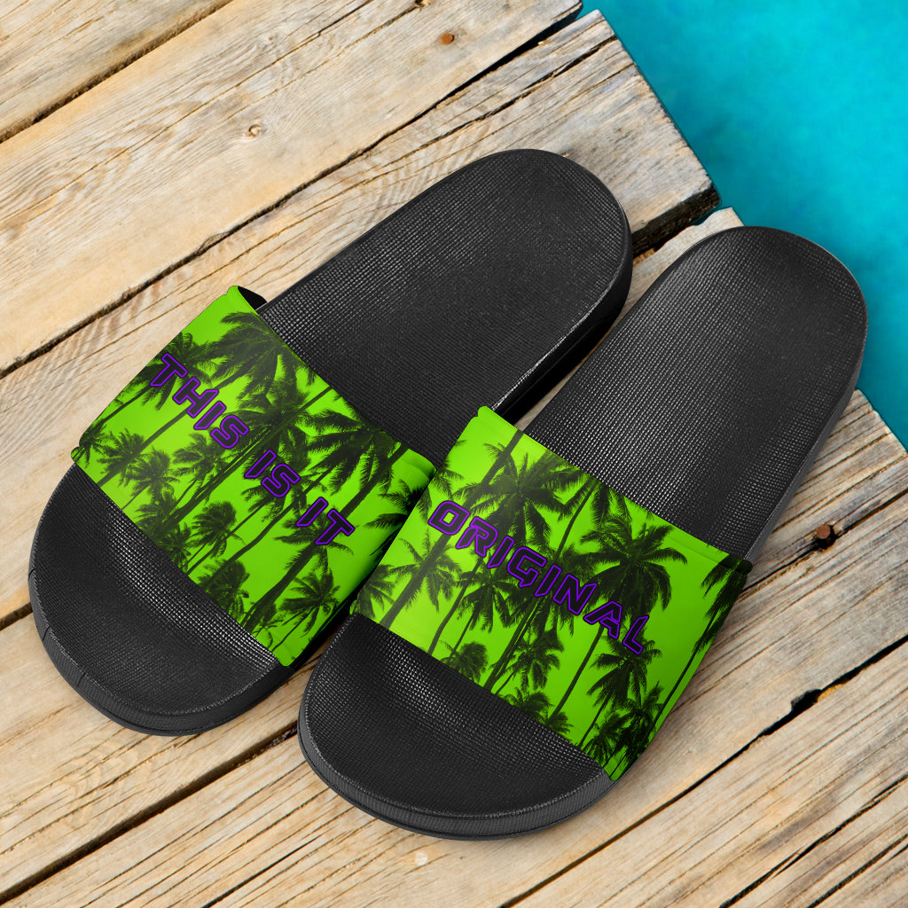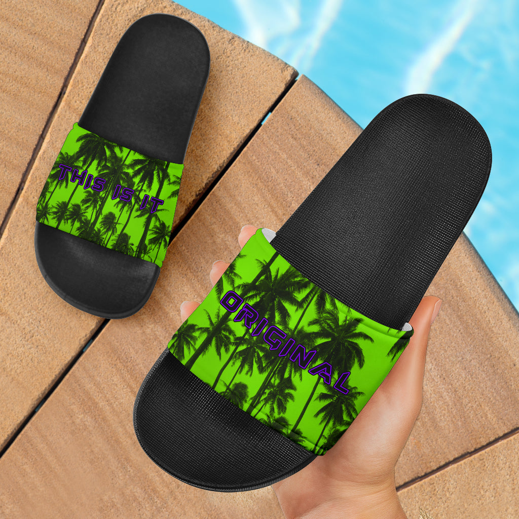 Neon Green Sky and Palm Tree Design Slide Sandals