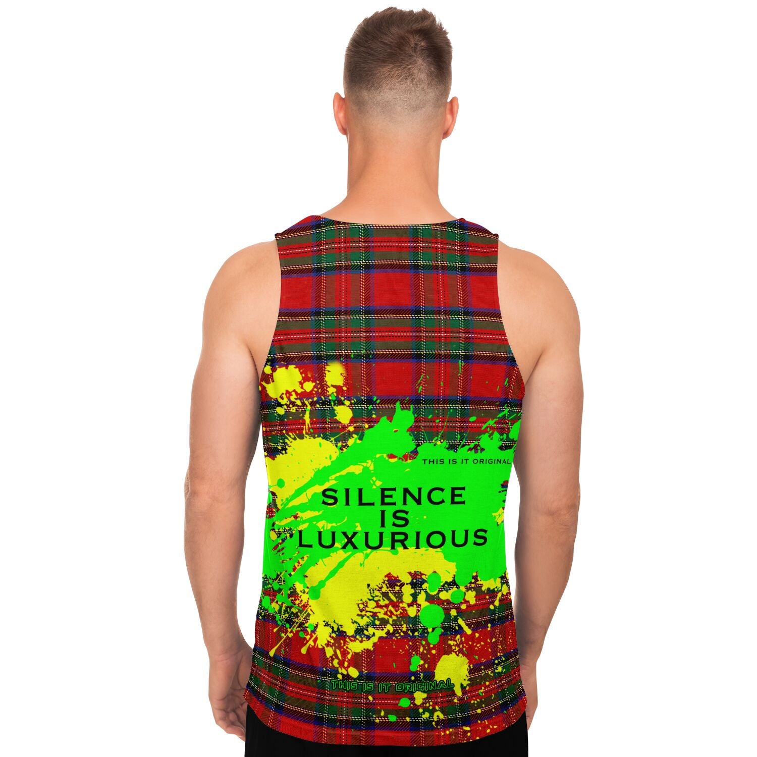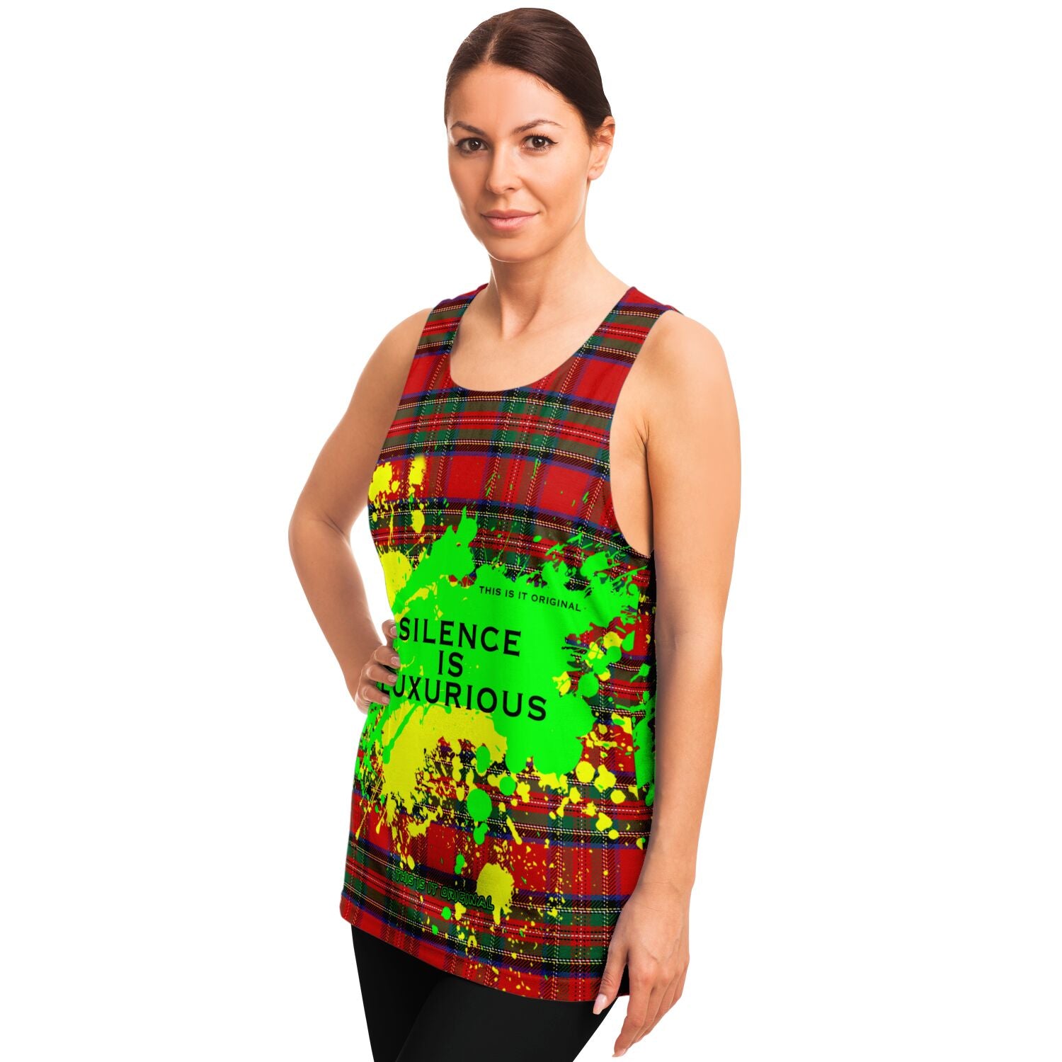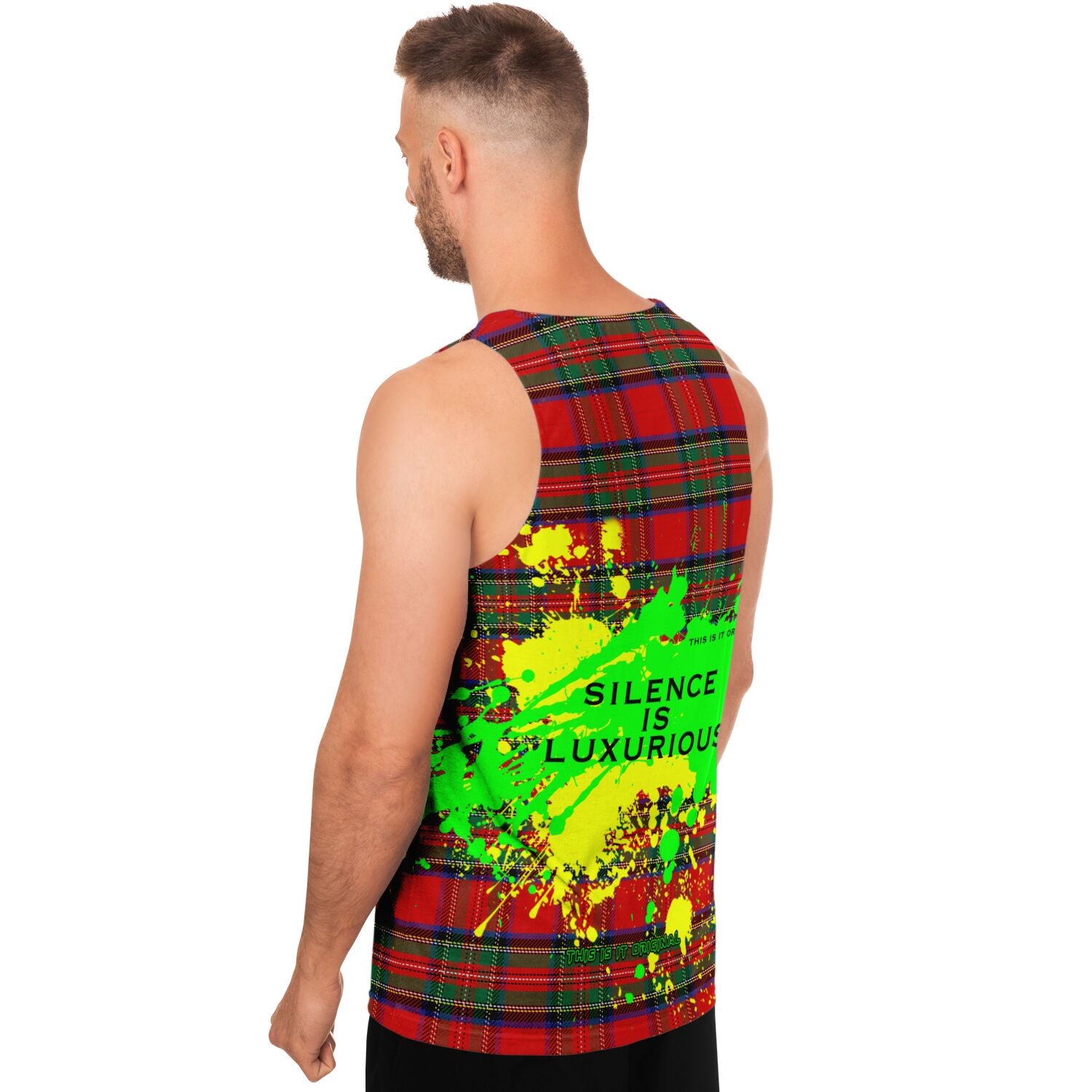Neon Yellow - Green Splash with Silence is Luxurious on Classic Red Tartan Design Unisex Tank Top