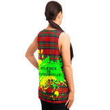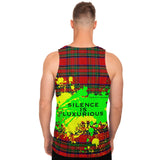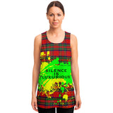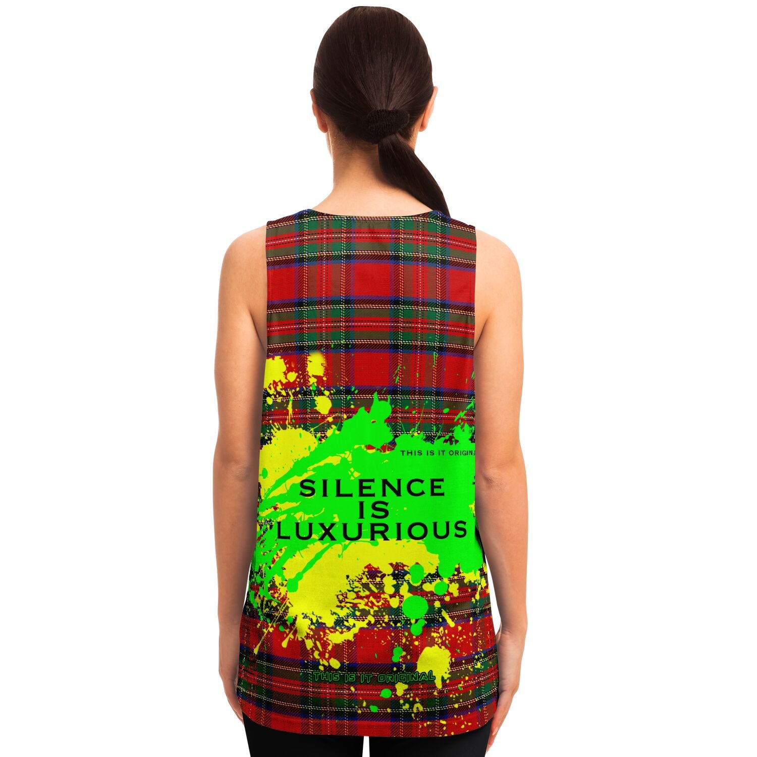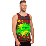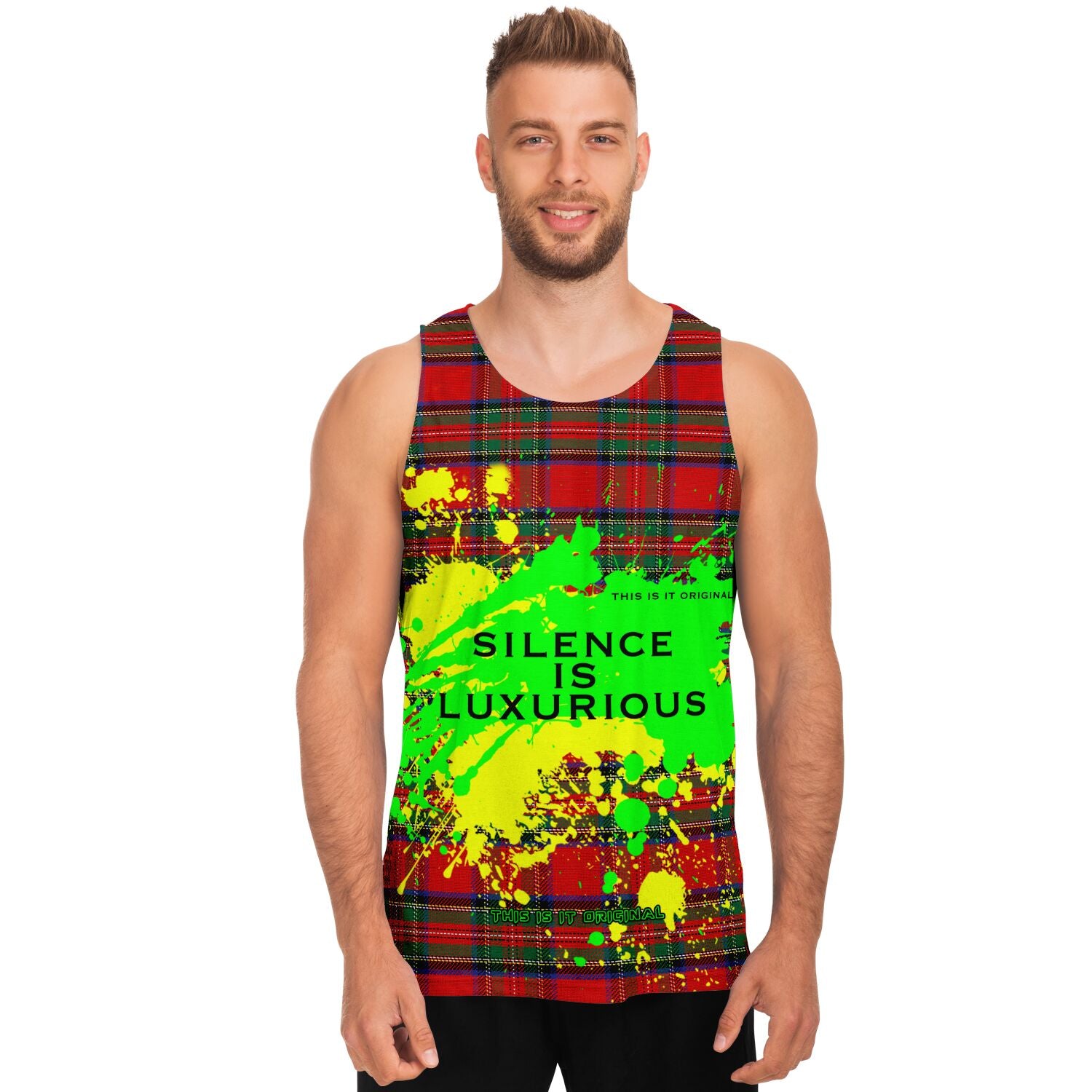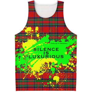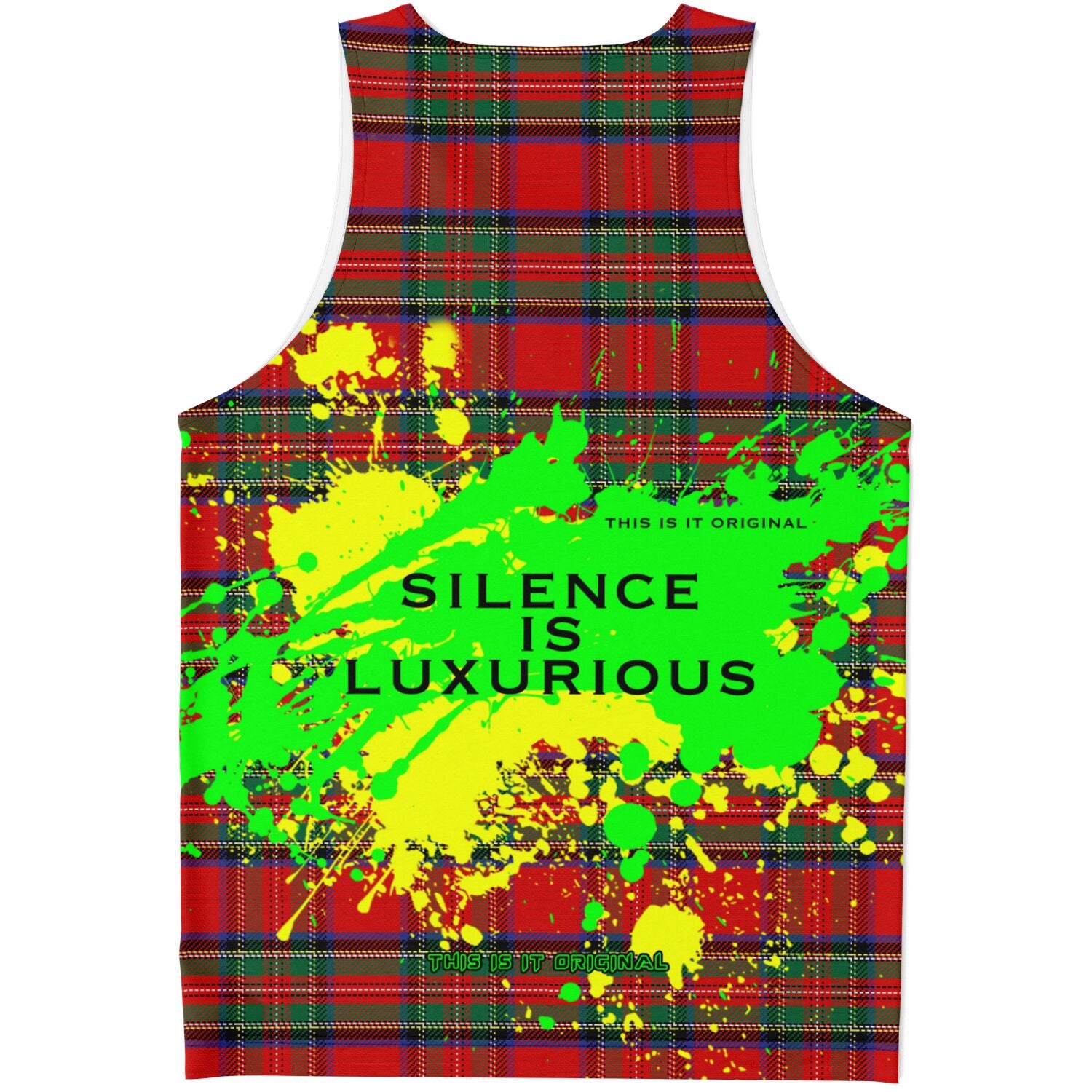 Neon Yellow - Green Splash with Silence is Luxurious on Classic Red Tartan Design Unisex Tank Top