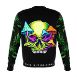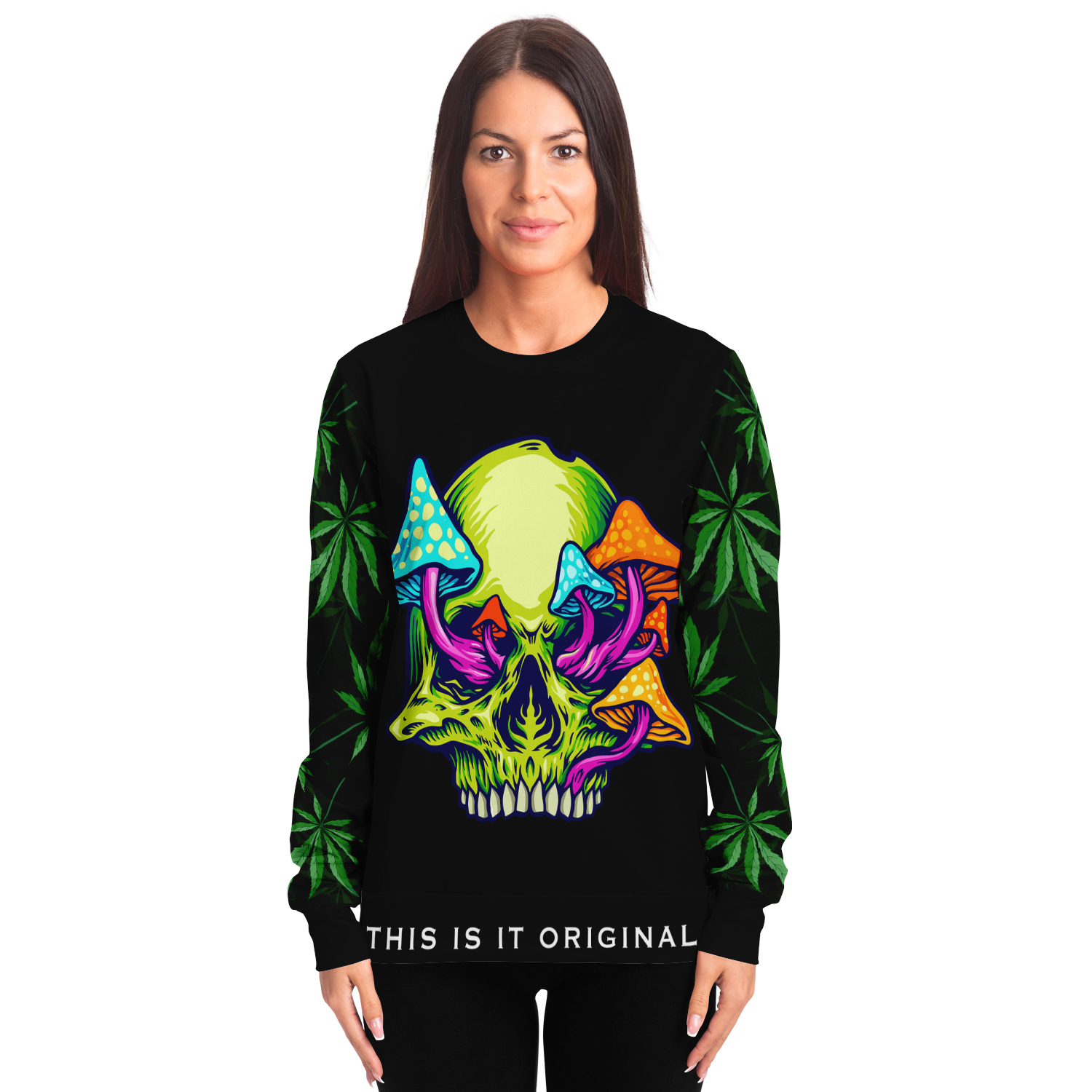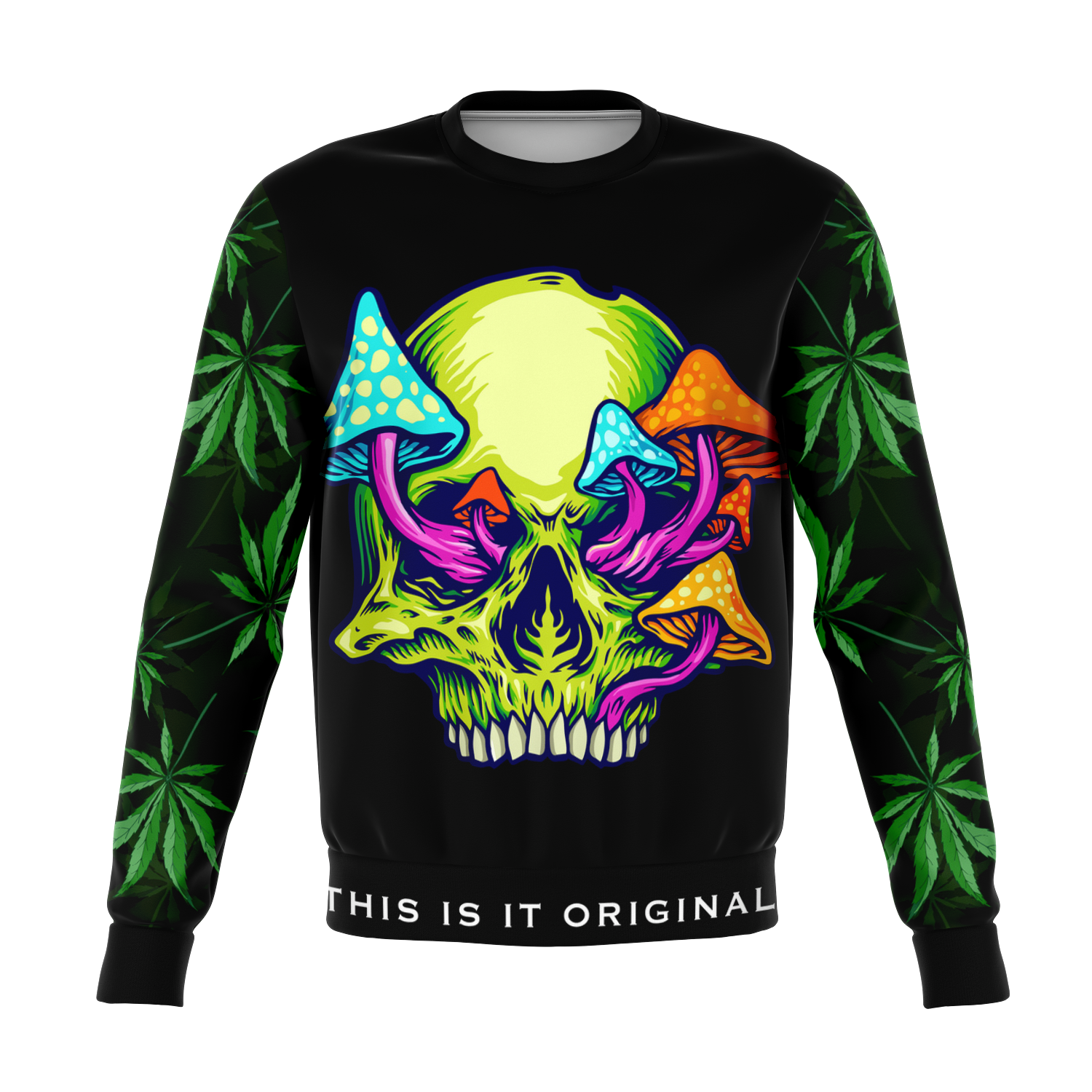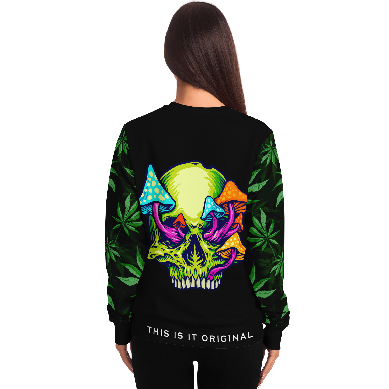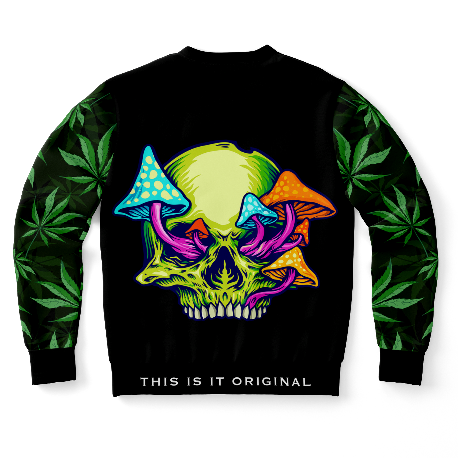 Psychedelic Neon Green Skull with Cannabis Art Work on Sleeves Design Luxury Fashion Unisex Sweatshirt