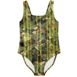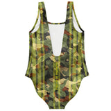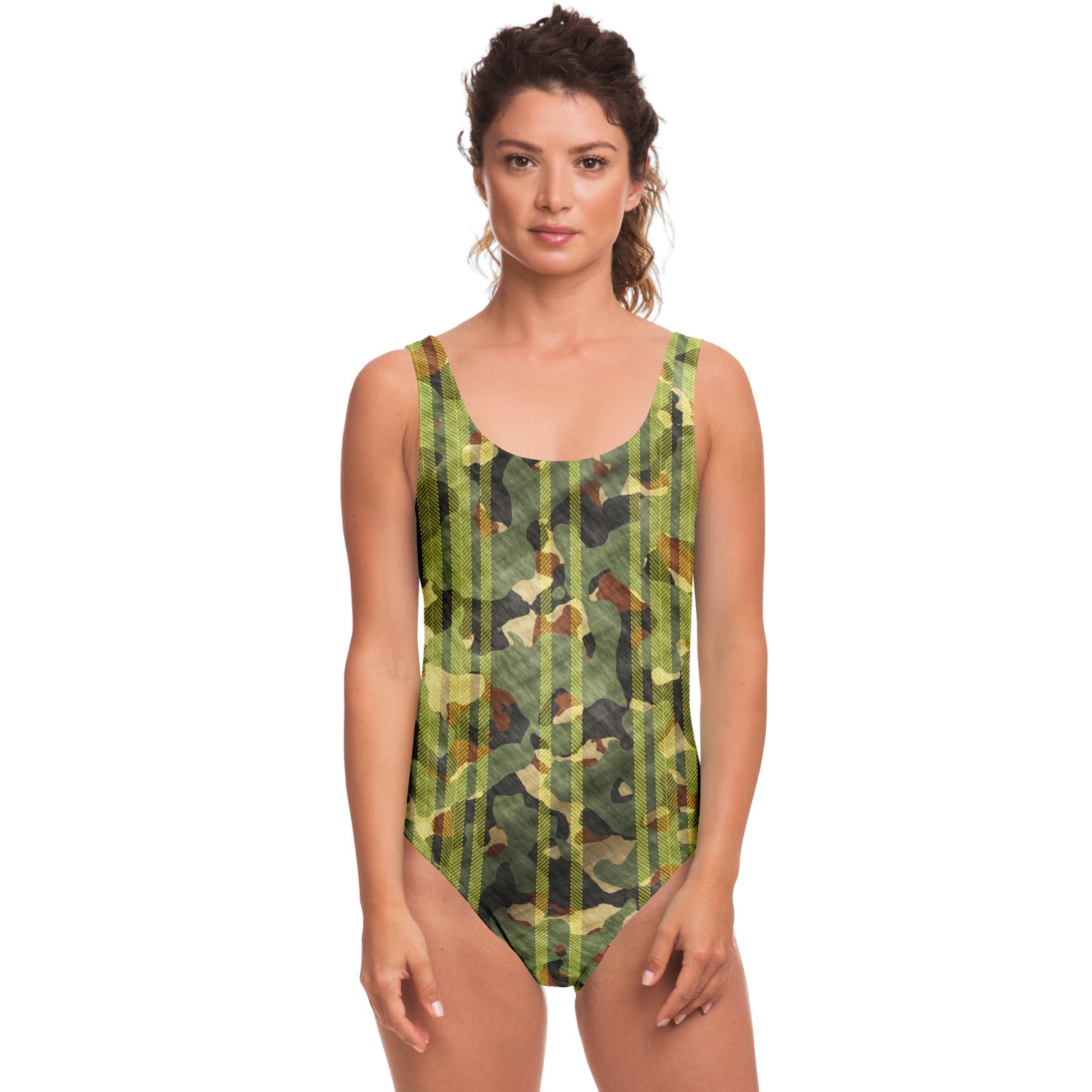 Real Army Green and Brown Pattern Design with Retro Yellow Stylish Stripes Luxury Swimsuit