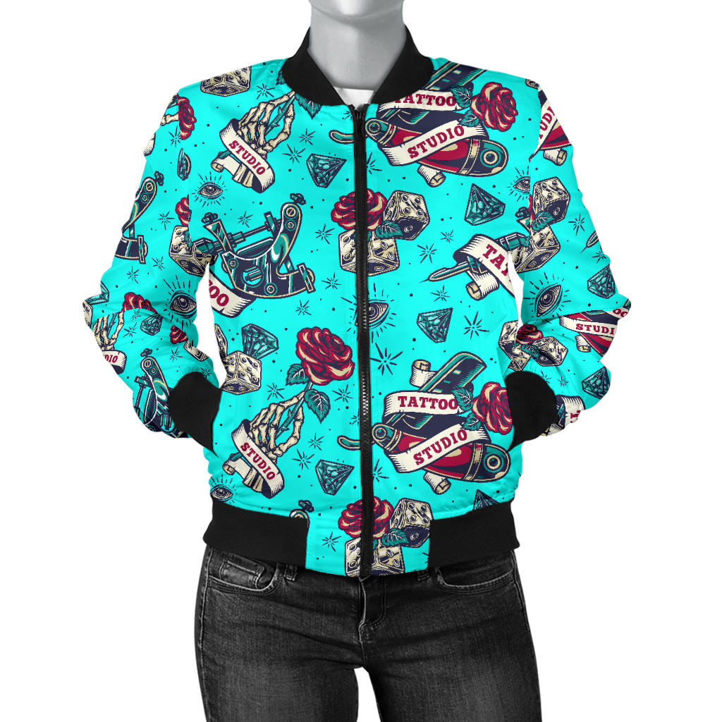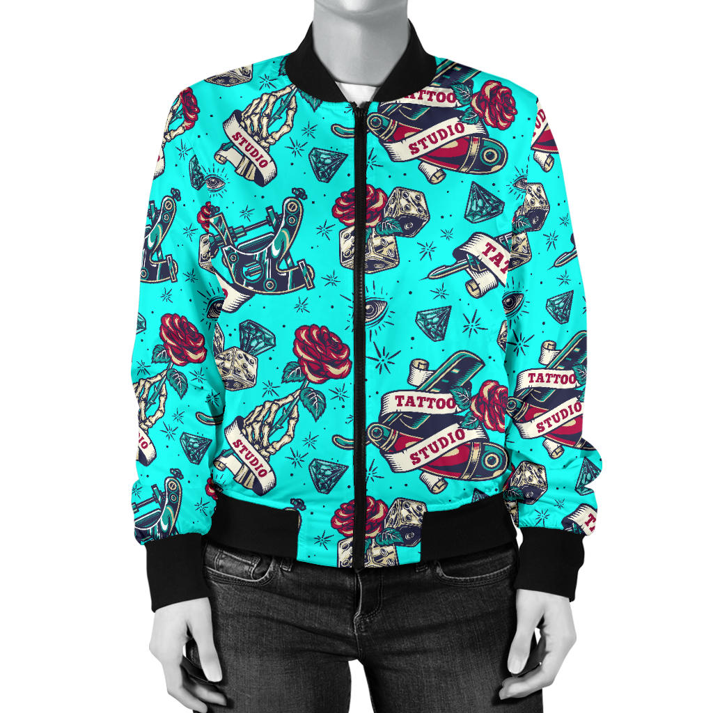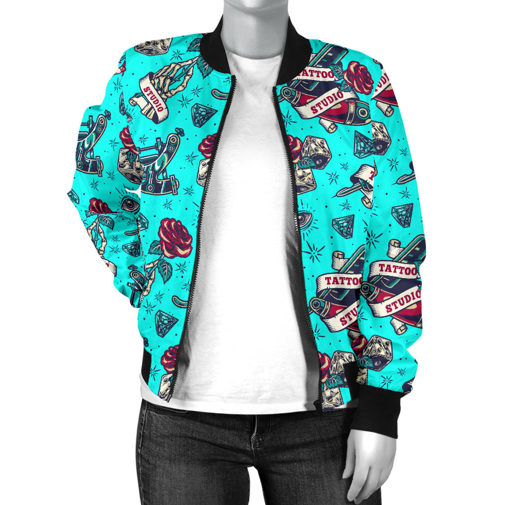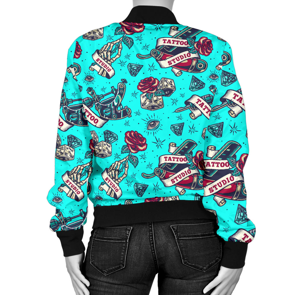 Tattoo Studio Design in Light Blue With Roses Women's Bomber Jacket